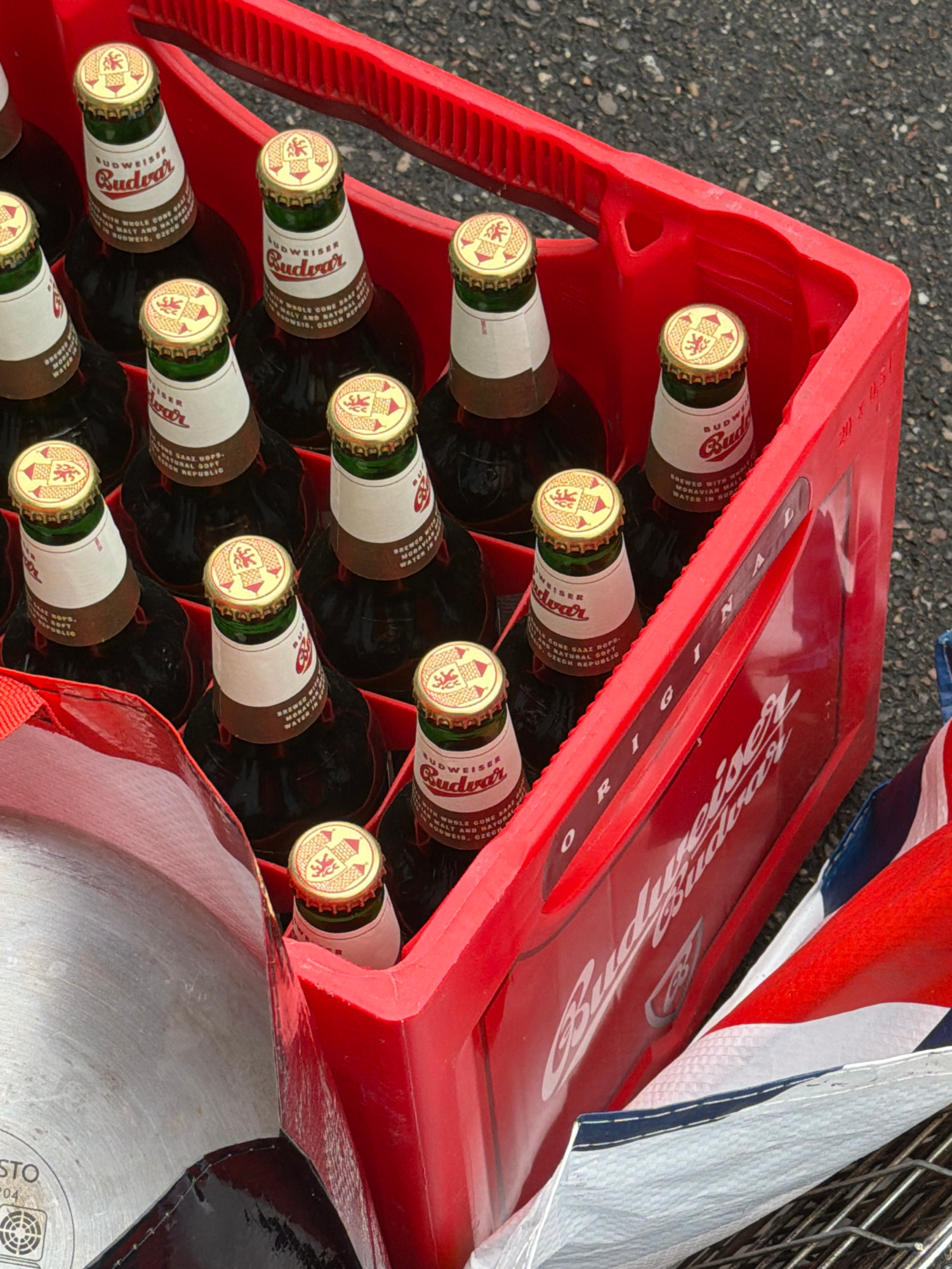 A high-angle, close-up shot shows a red plastic crate filled with several bottles of Budweiser Budvar beer. The crate, marked with "Budweiser Budvar ORIGINAL", is partially covered by a white and redβ¦read more