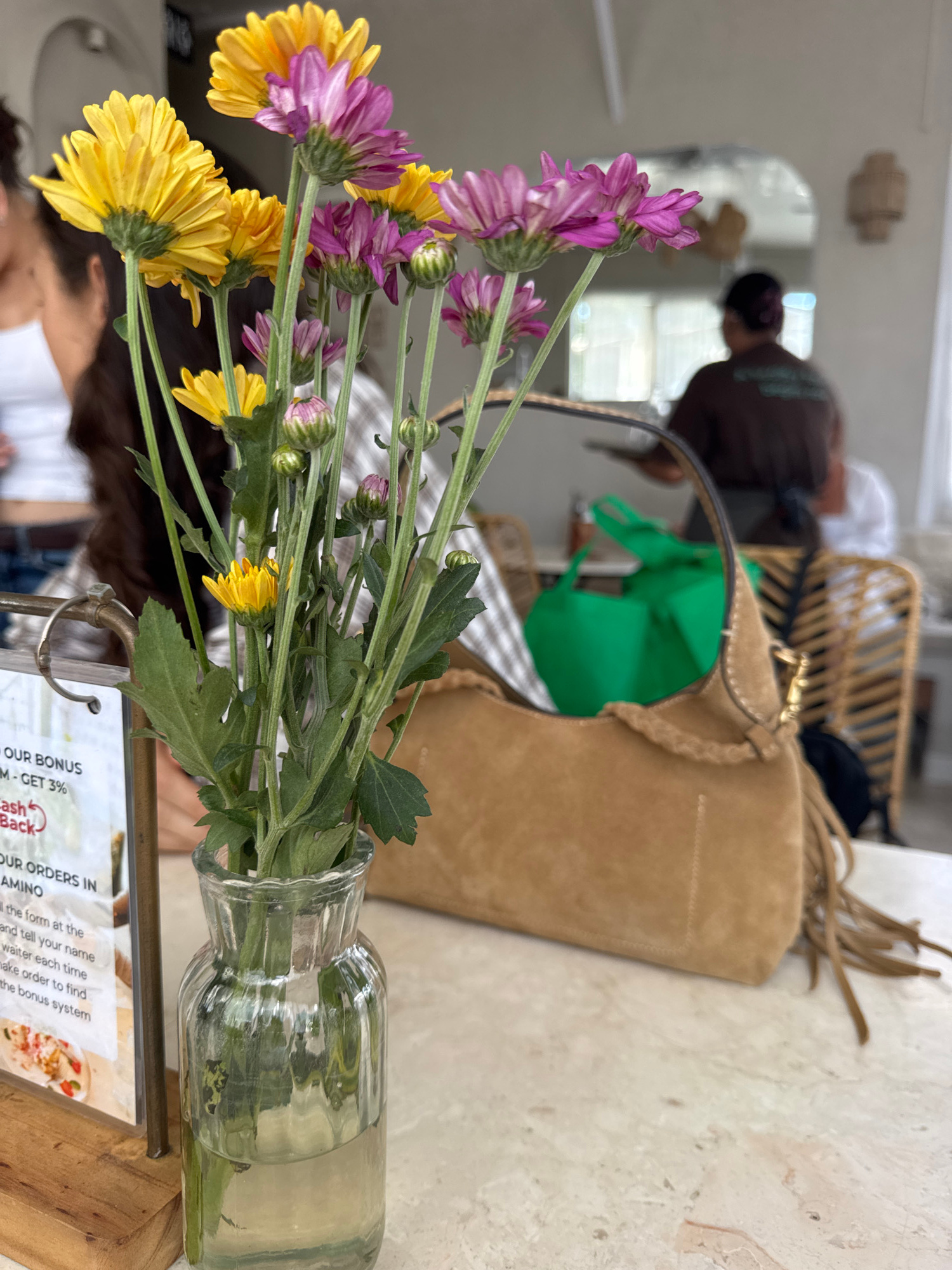 The scene captures an interior setting, likely a cafe or restaurant, as evidenced by the presence of a table, flowers in a glass vase, a menu card, and background elements suggesting a dining area. In…read more