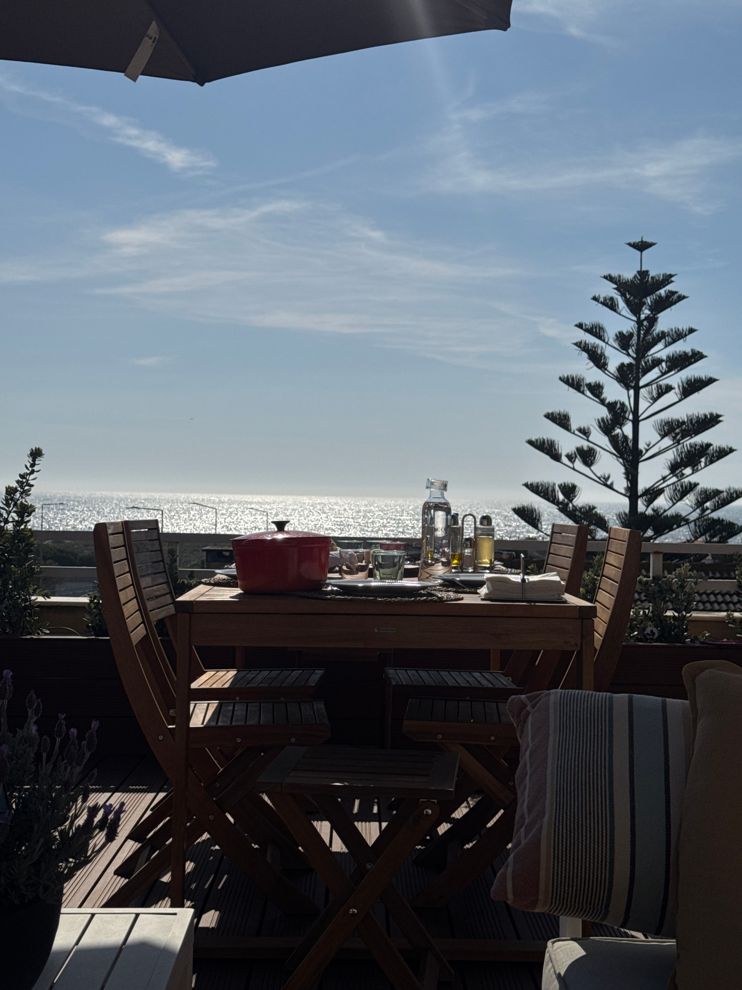 The image, oriented vertically, depicts an outdoor dining setup on a sunny day, overlooking a shimmering body of water. In the center of the frame, a rustic wooden outdoor dining table is set with va…read more