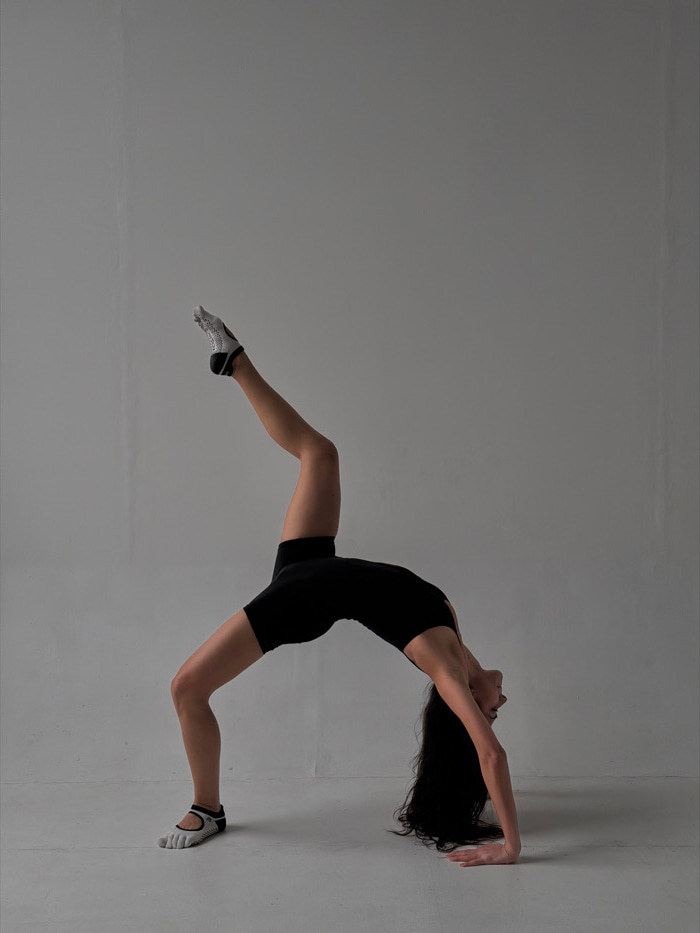 An individual is captured performing a backbend with one leg extended vertically upwards in an indoor setting in Yerevan, Armenia. The subject, an adult female with long dark hair, is positioned with…read more