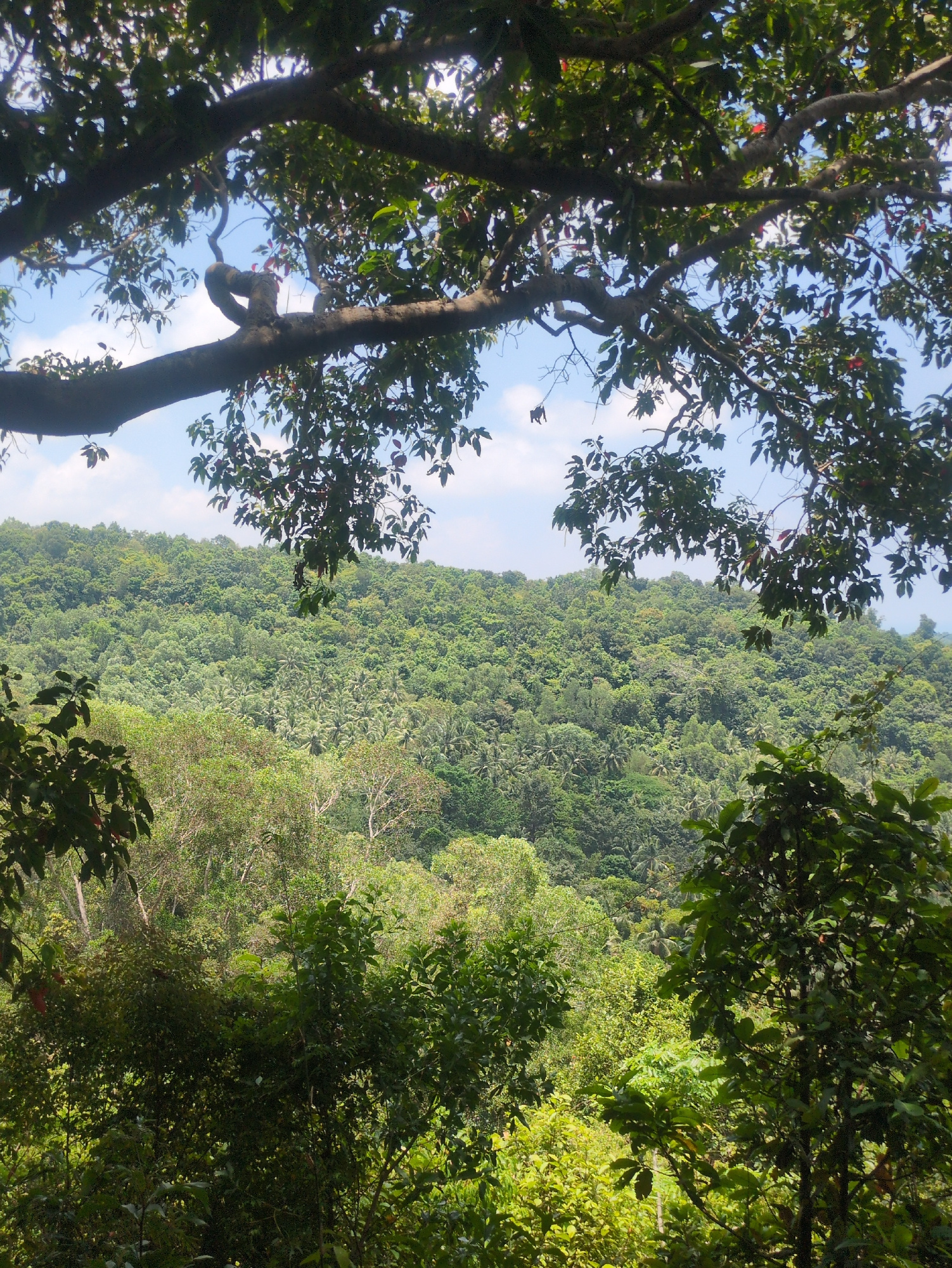 A landscape view in Phú Quốc, Vietnam, showcases a dense, verdant forest blanketing a hillside. The scene is framed by tree branches and leaves in the foreground, creating a natural border. The sky, visible through the trees, is pale blue with scattered clouds. The forest appears lush with varying shades of green, indicating different tree species and foliage density. | Open Wire