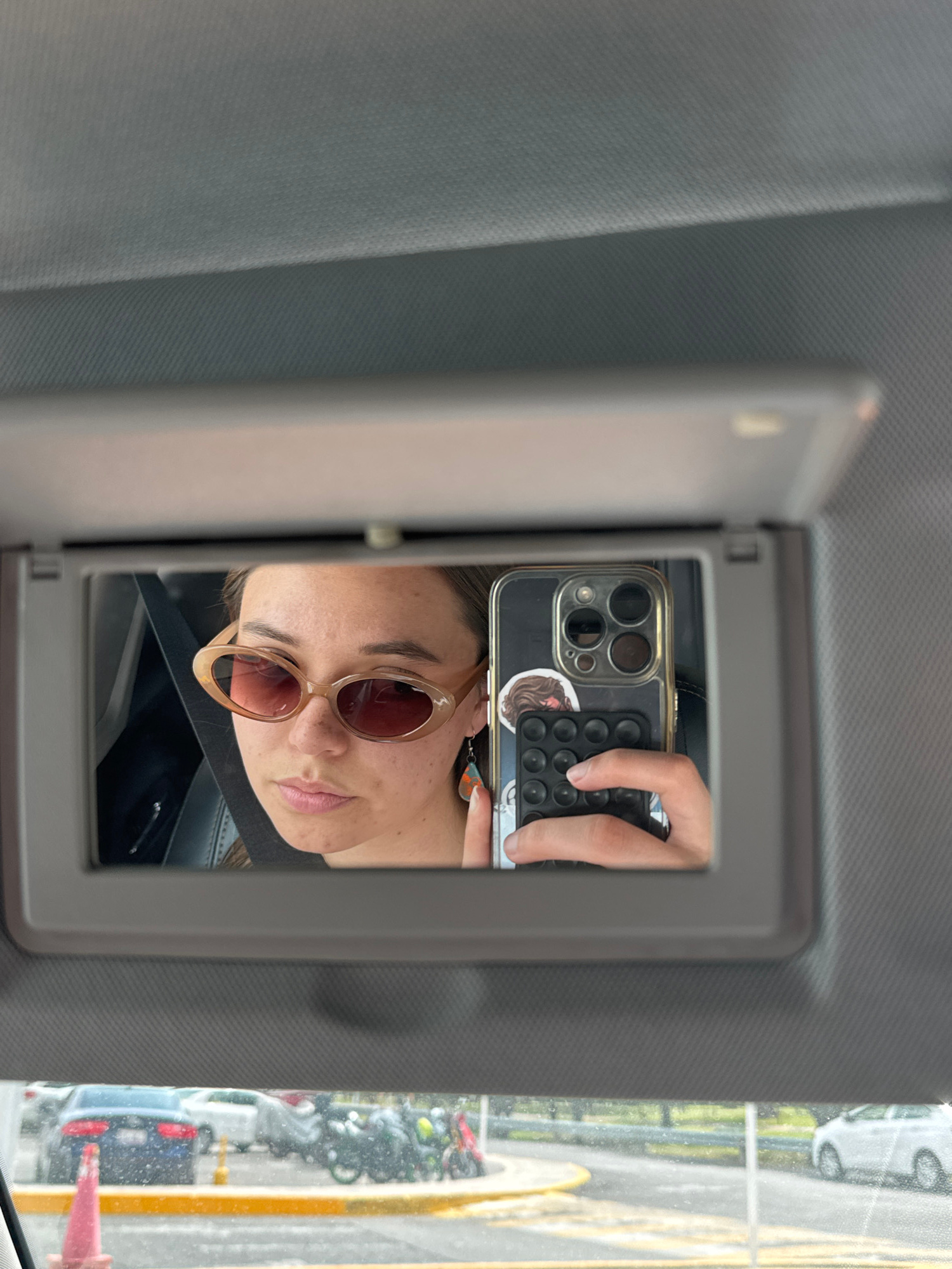 A woman takes a selfie in the mirror of a car visor. She wears sunglasses and holds a black iPhone with a pop-it case. The car is in San Andrés Cholula, Mexico, as indicated by the license plates and…read more
