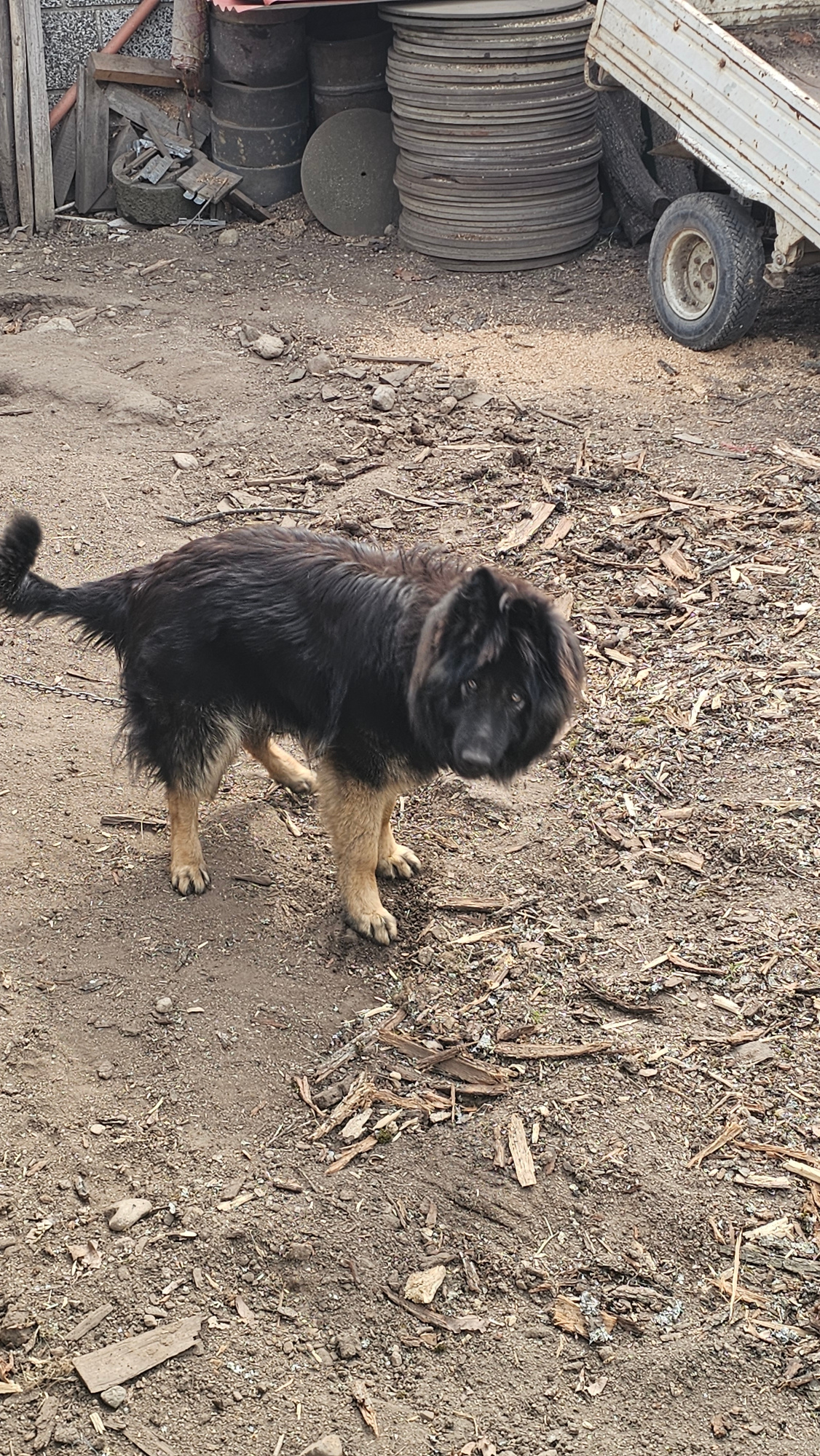 The image depicts a medium-sized, black and brown dog standing on a dirt ground covered with wood chips and debris. The dog is looking to the left. In the background to the left are stacked metal disc…read more