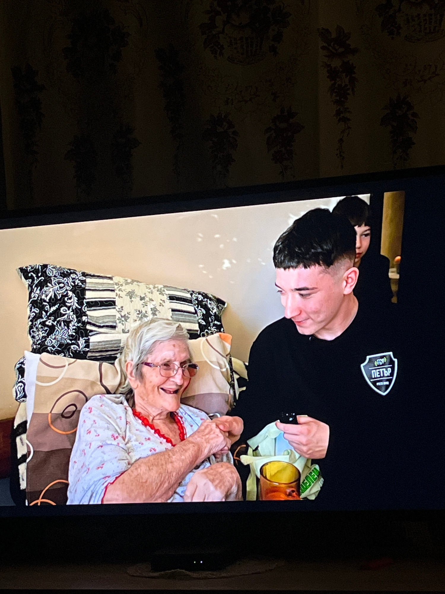 A young man in a black shirt with a patch that says "ПЕТЪР" is bending over an elderly woman lying in bed. The woman is wearing glasses and a patterned shirt with red trim. The bed has a pillow with a…read more