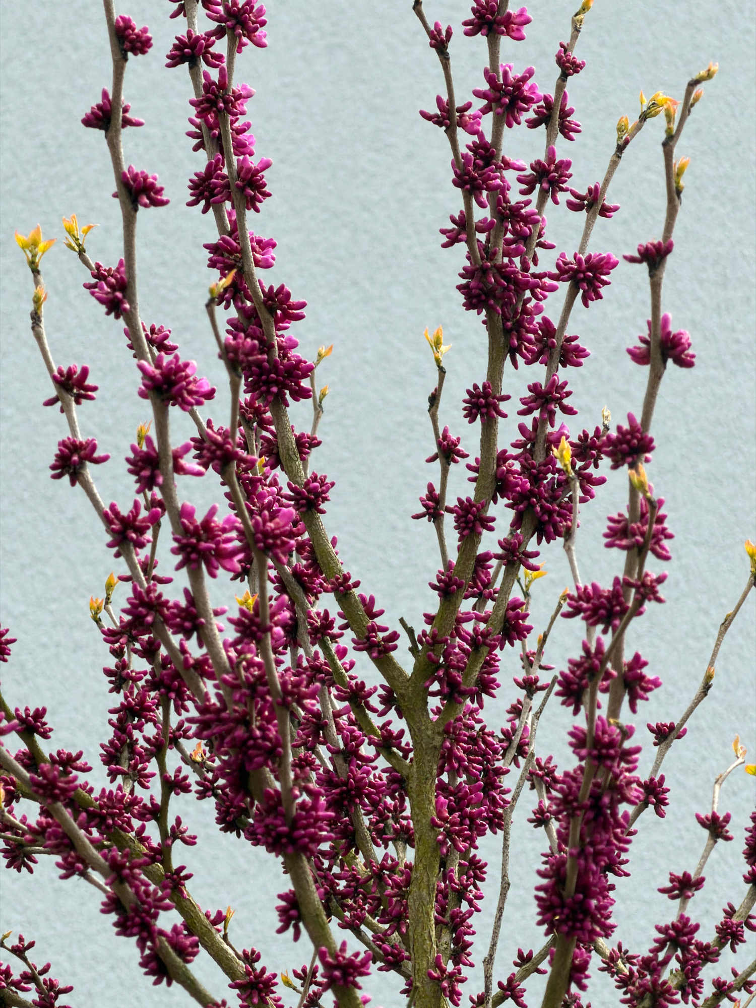 The image depicts a close-up view of branches adorned with vibrant magenta blossoms. The branches, varying in thickness, extend across the frame against a soft, neutral background. Small, emerging yel…read more