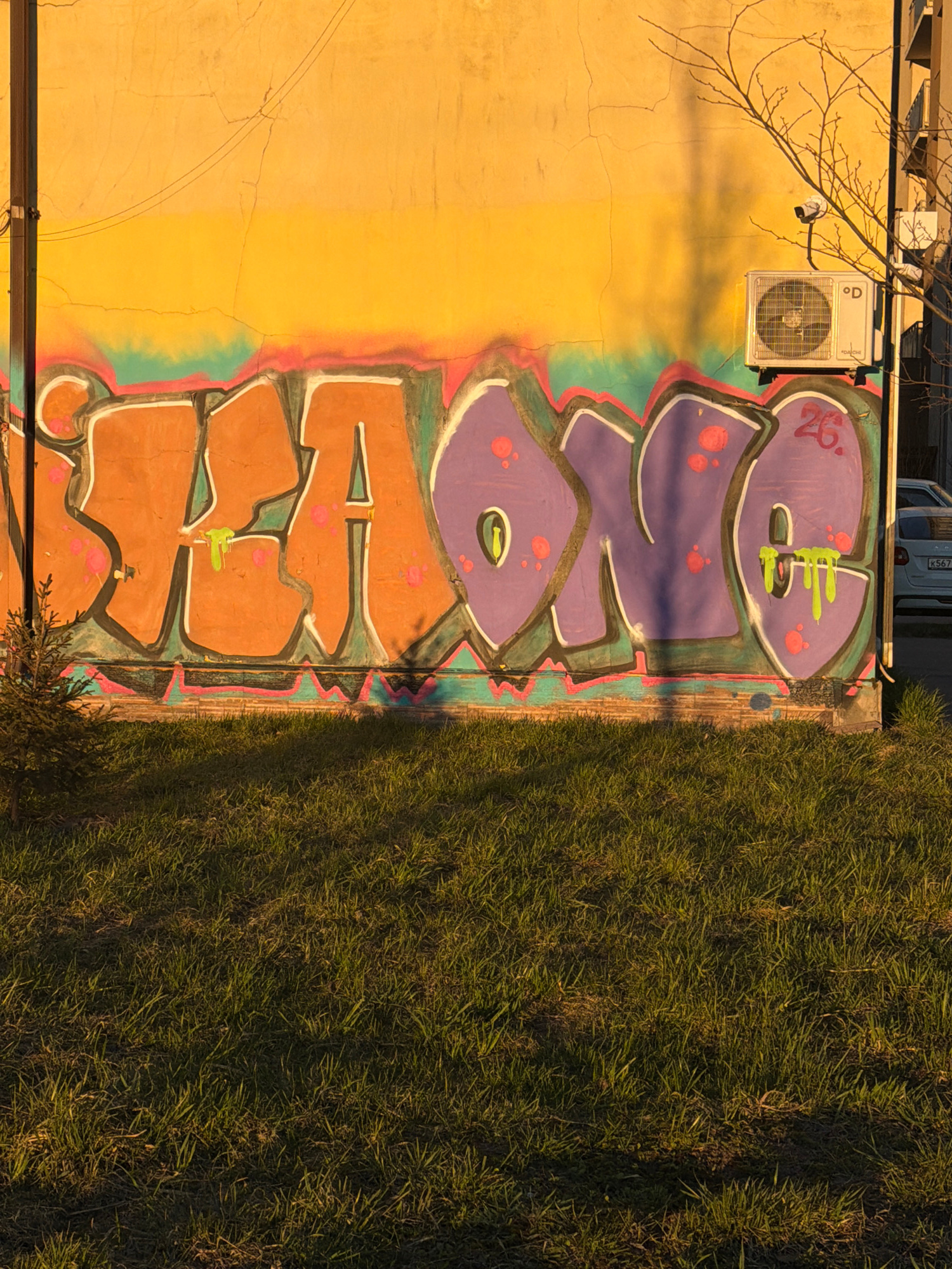 A ground-level view of a building in Murino, Russia reveals an exterior wall adorned with graffiti. The graffiti consists of stacked, stylized block lettering in purple and orange, with accents in gre…read more