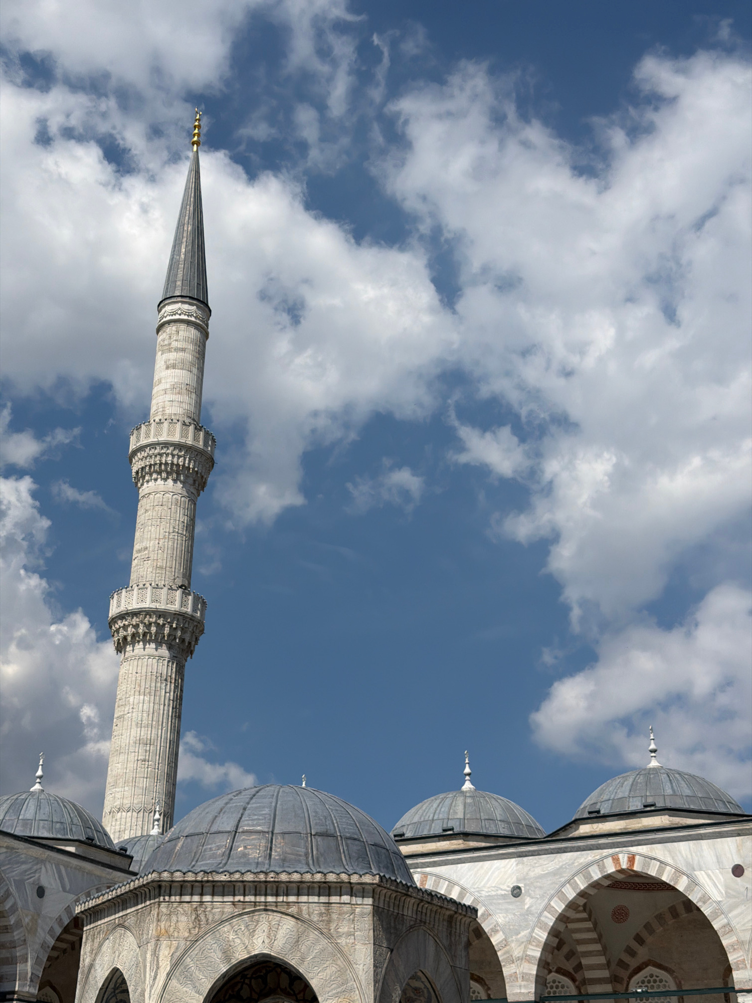 The image shows a low-angle view of a mosque in Istanbul, Turkey. The architecture features a tall, slender minaret made of light-colored stone, and several domes. The minaret has decorative horizonta…read more