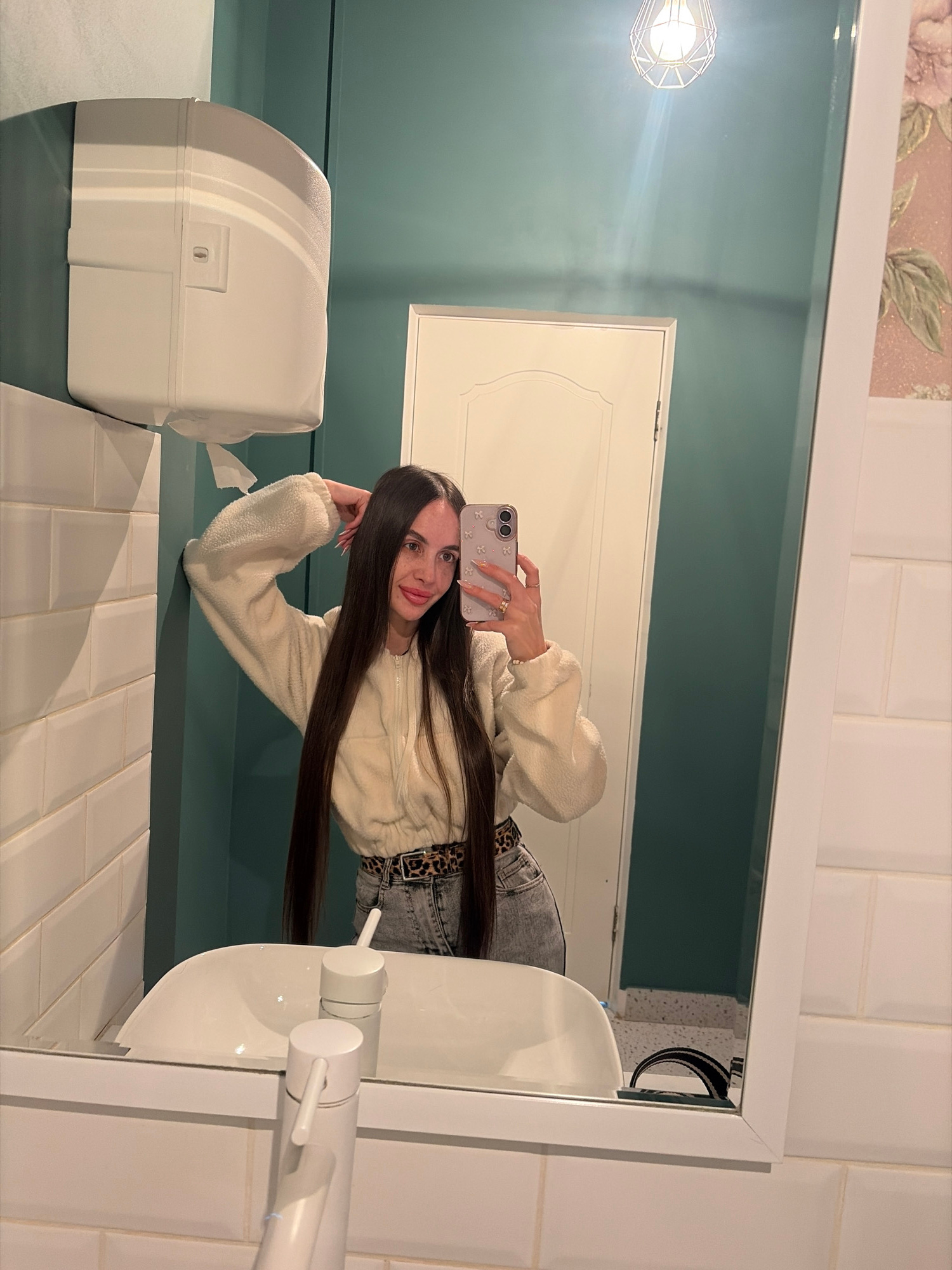 A young woman with long dark hair is taking a selfie in a bathroom mirror. She's wearing a cream-colored fuzzy jacket, and grey jeans with a leopard print belt. The bathroom has a blue-green wall, whi…read more