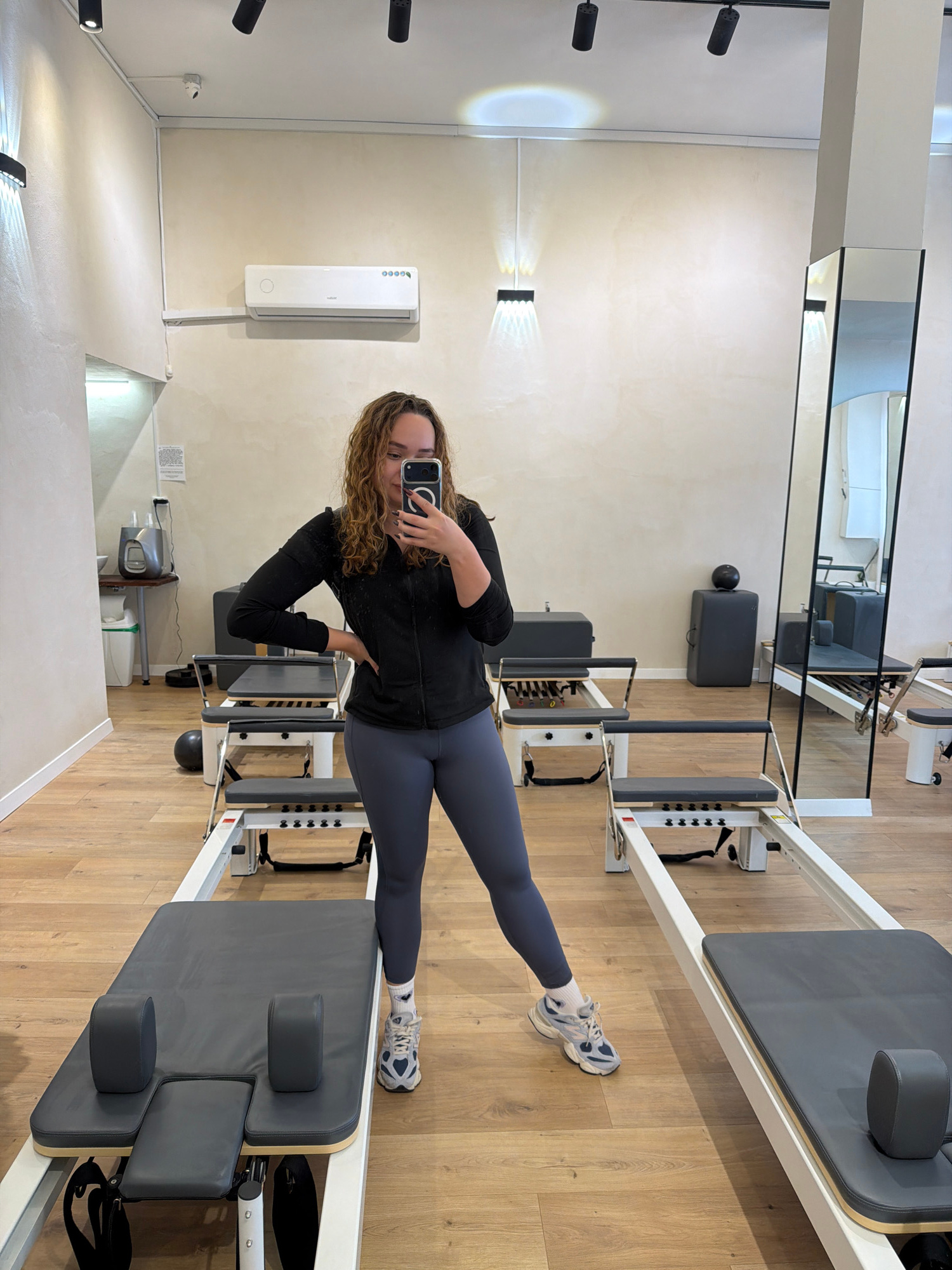 A person is standing in a fitness studio in Ramat Gan, Israel, in front of two Pilates reformer machines. The person is wearing a black jacket, gray leggings, and sneakers, and is holding a phone up t…read more