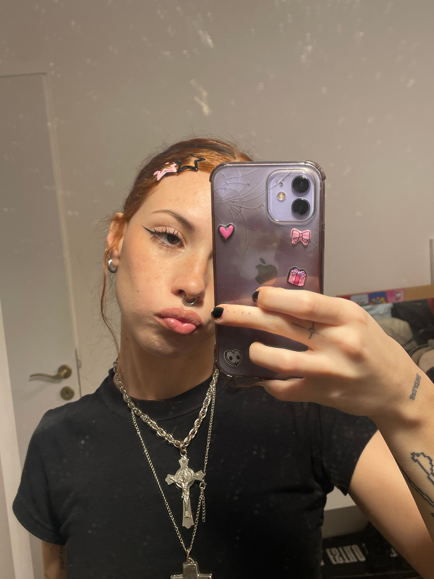 A young person is taking a selfie in a mirror. The person is wearing a black t-shirt, a silver necklace with cross pendants, and has a nose ring. They have light brown hair and winged eyeliner. Their…read more
