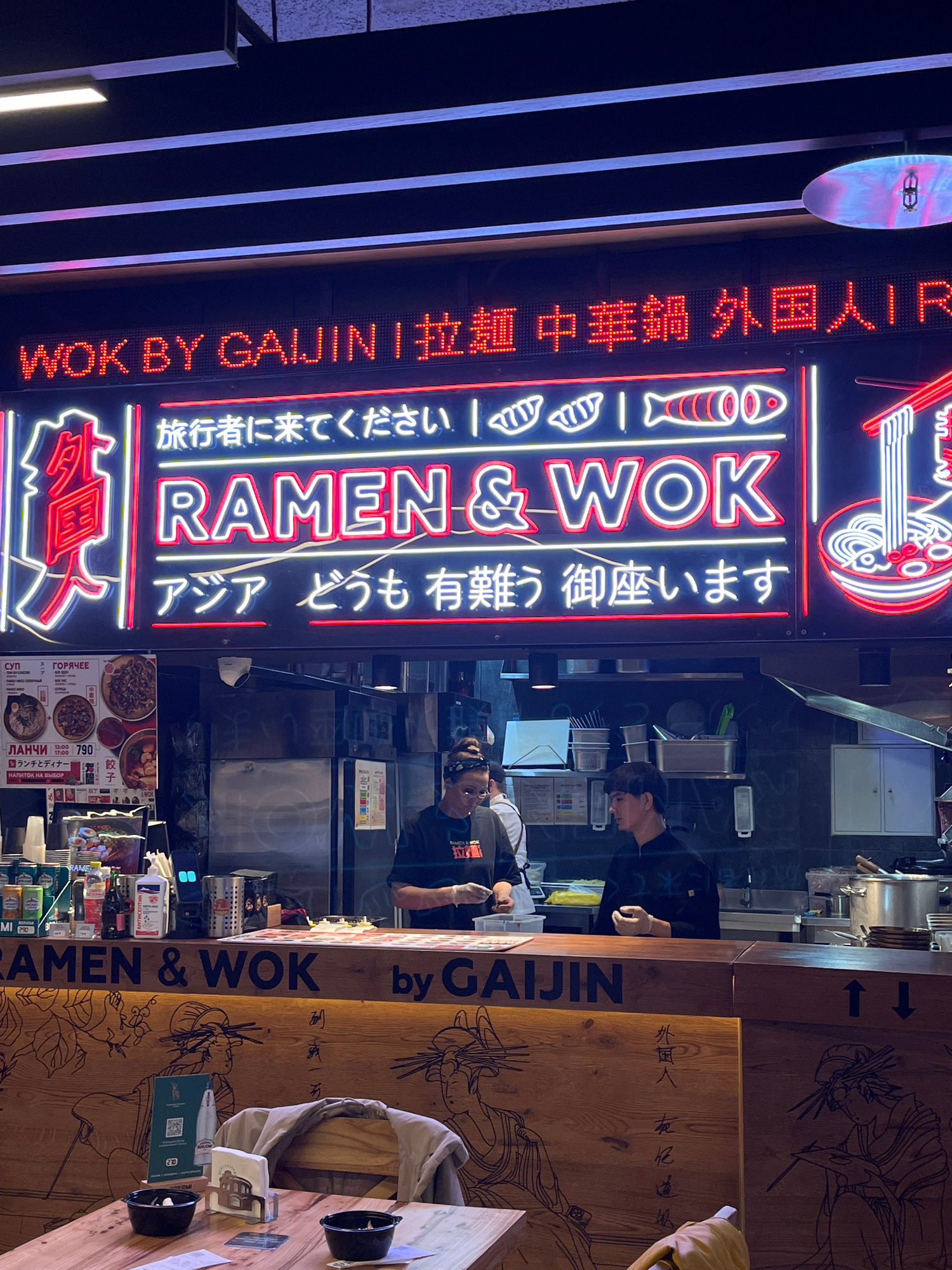 The image shows the exterior of a restaurant called "Ramen & Wok by Gaijin" located in Moscow, Russia. The restaurant name is prominently displayed in a neon sign with Japanese and English characters,…read more