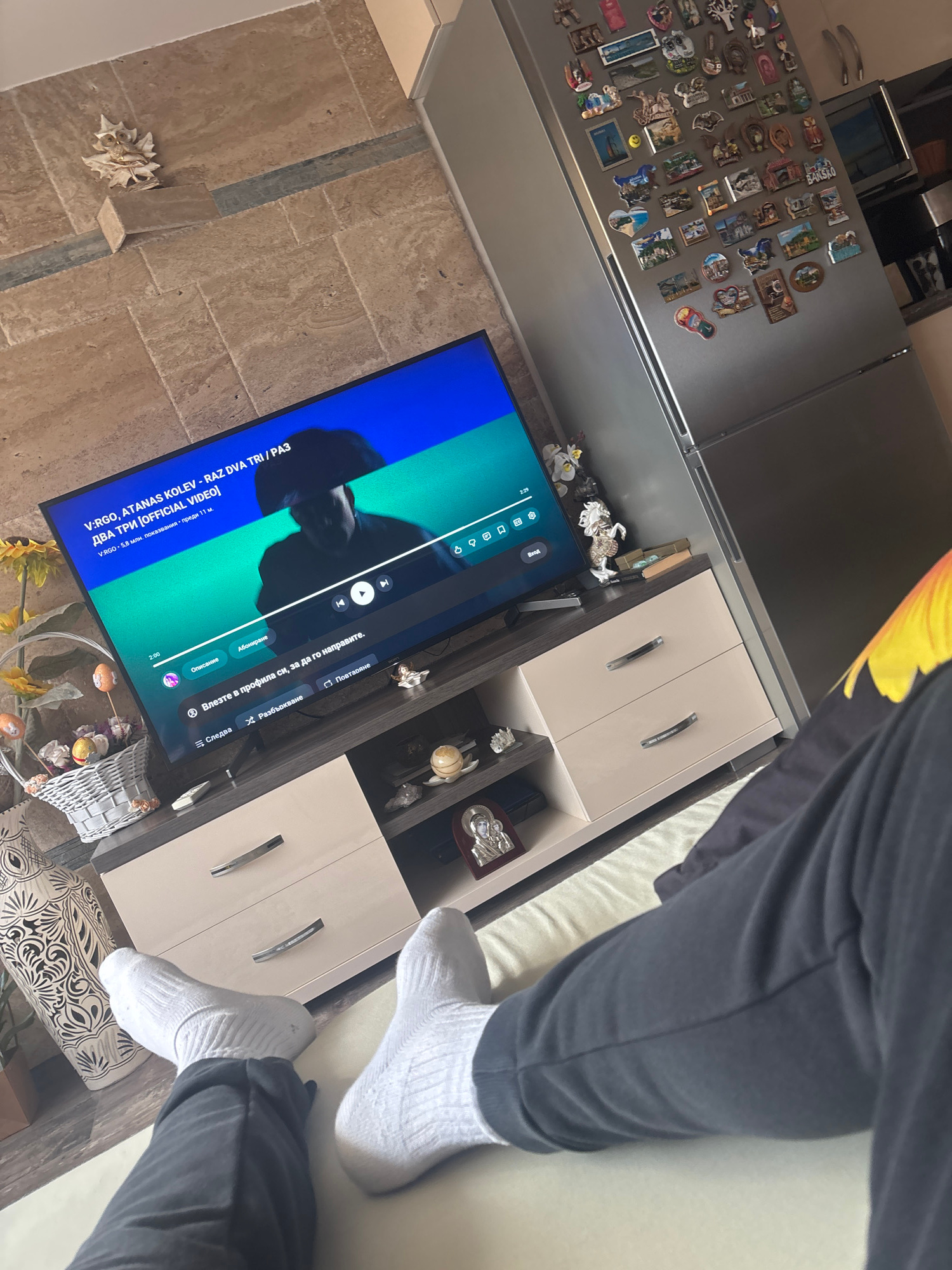 Here is a detailed description of the image: **Scene:** An indoor shot from a slightly elevated angle. **Objects:** * **Television:** A flat-screen TV displaying a music video from the Bulgarian artist V:RGO, specifically the song "ATANAS KOLEV - RAZ DVA TRI / РАЗ ДВА ТРИ [OFFICIAL VIDEO]". The YouTube interface is visible, showing the progress bar and play/pause button. The video has had 5.8 million views and was uploaded 11 months ago. * **Furniture:** A cabinet, likely a TV stand, with storage compartments and drawers. A sofa or soft cushion is present. * **Refrigerator:** A large refrigerator with numerous magnets attached to its surface. * **Vase:** A vase of sunflowers on the floor. * **Decoration:** Small decorative objects, possibly Easter-themed, are scattered around the TV stand. * **Footwear:** White socks on a person's feet. * **Clothing:** The person is wearing dark grey pants. **People:** * A person is present, though only their legs and feet are visible. **Environment:** * **Flooring:** Tiled flooring. * The location is unknown. The scene does not appear to be in the city of Burgas, Bulgaria, the OCR of the image is the title of the music video that is showing on the television. | Open Wire