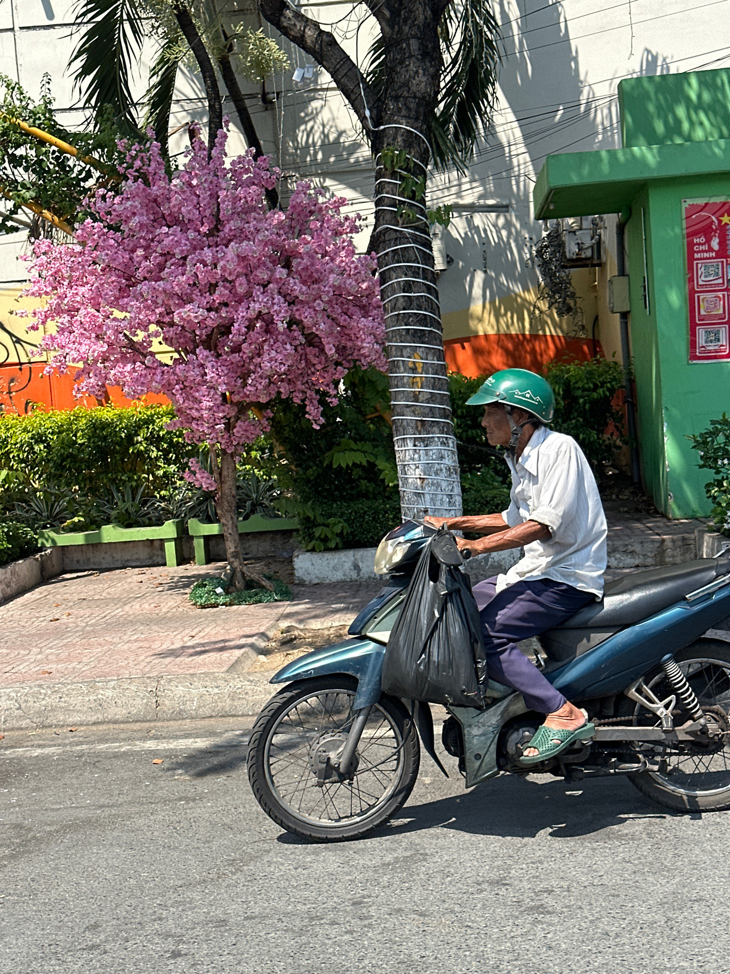 A man is seen leaning over a moped on a street in Thủ Đức, Vietnam. The man is wearing a white shirt, blue pants, and a green helmet, and green sandals. A black plastic bag is hanging from the front o…read more