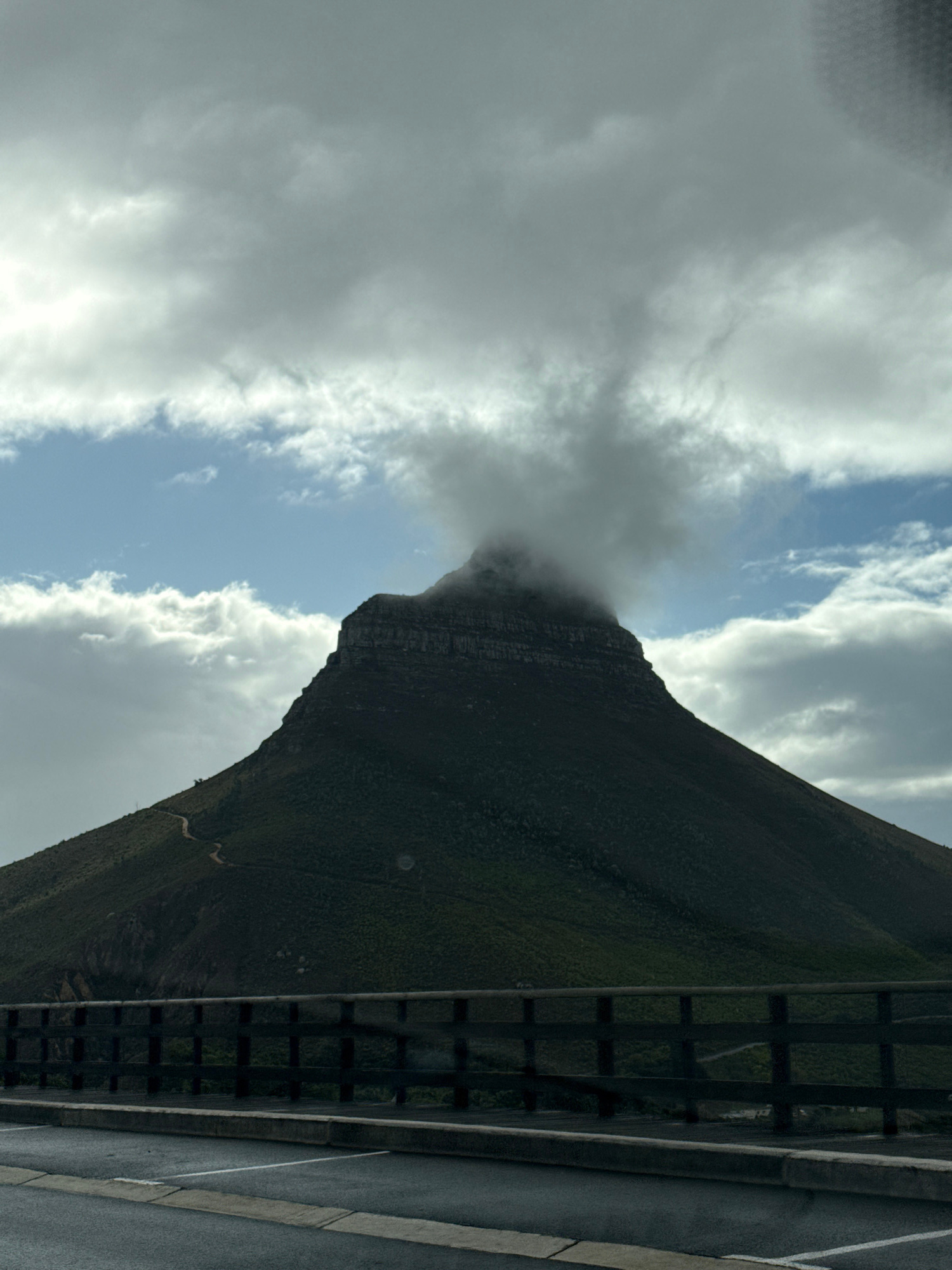 The image shows Lion's Head mountain in Cape Town, South Africa, its peak obscured by clouds. A roadway with a barrier runs along the bottom right of the frame. The sky is filled with a mix of white a…read more