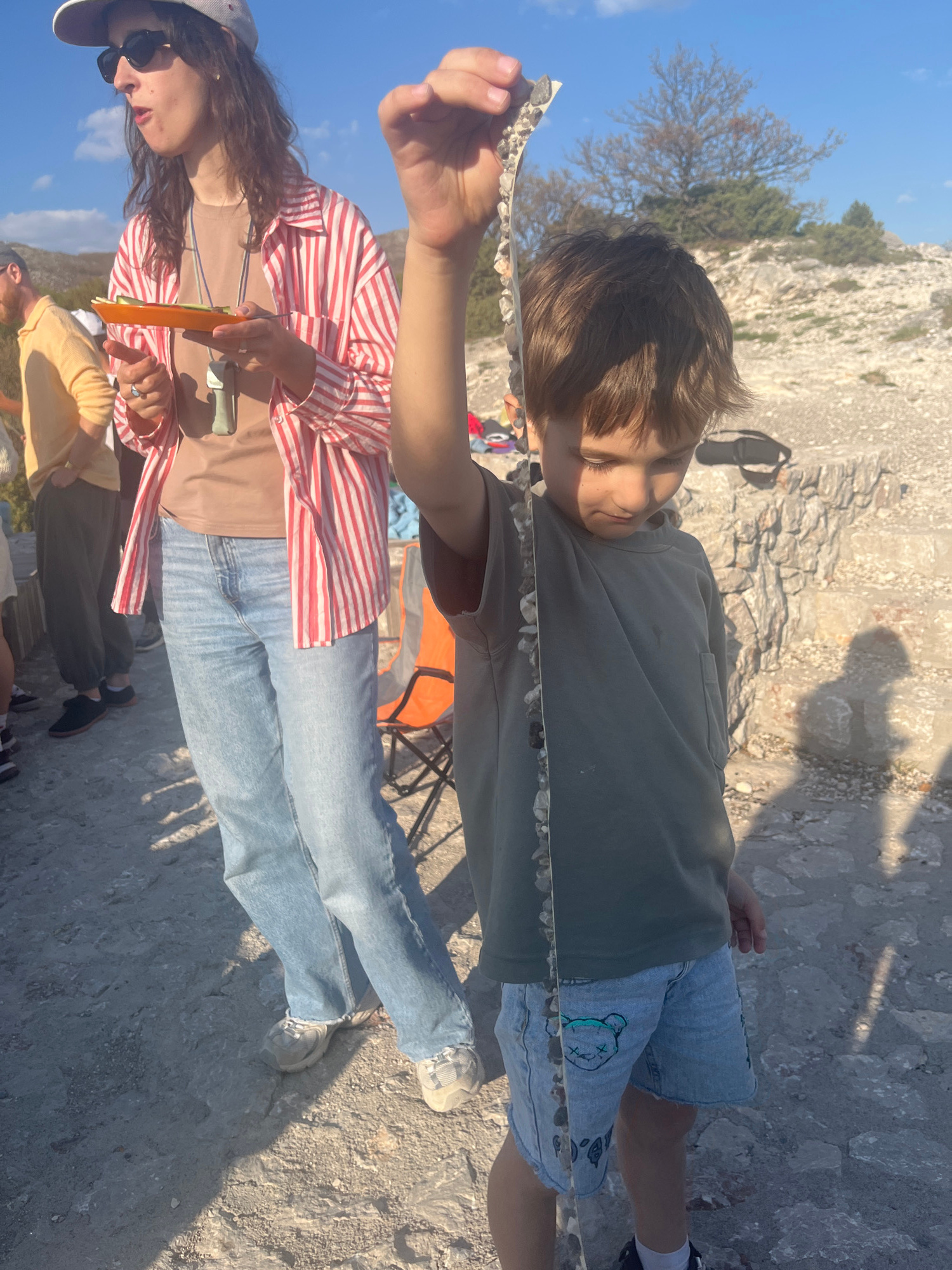 The image, taken at Čelobrdo, Montenegro, depicts an outdoor scene under bright sunlight, indicating midday or early afternoon. In the foreground, a young boy with brown hair, wearing a dark green t-s…read more