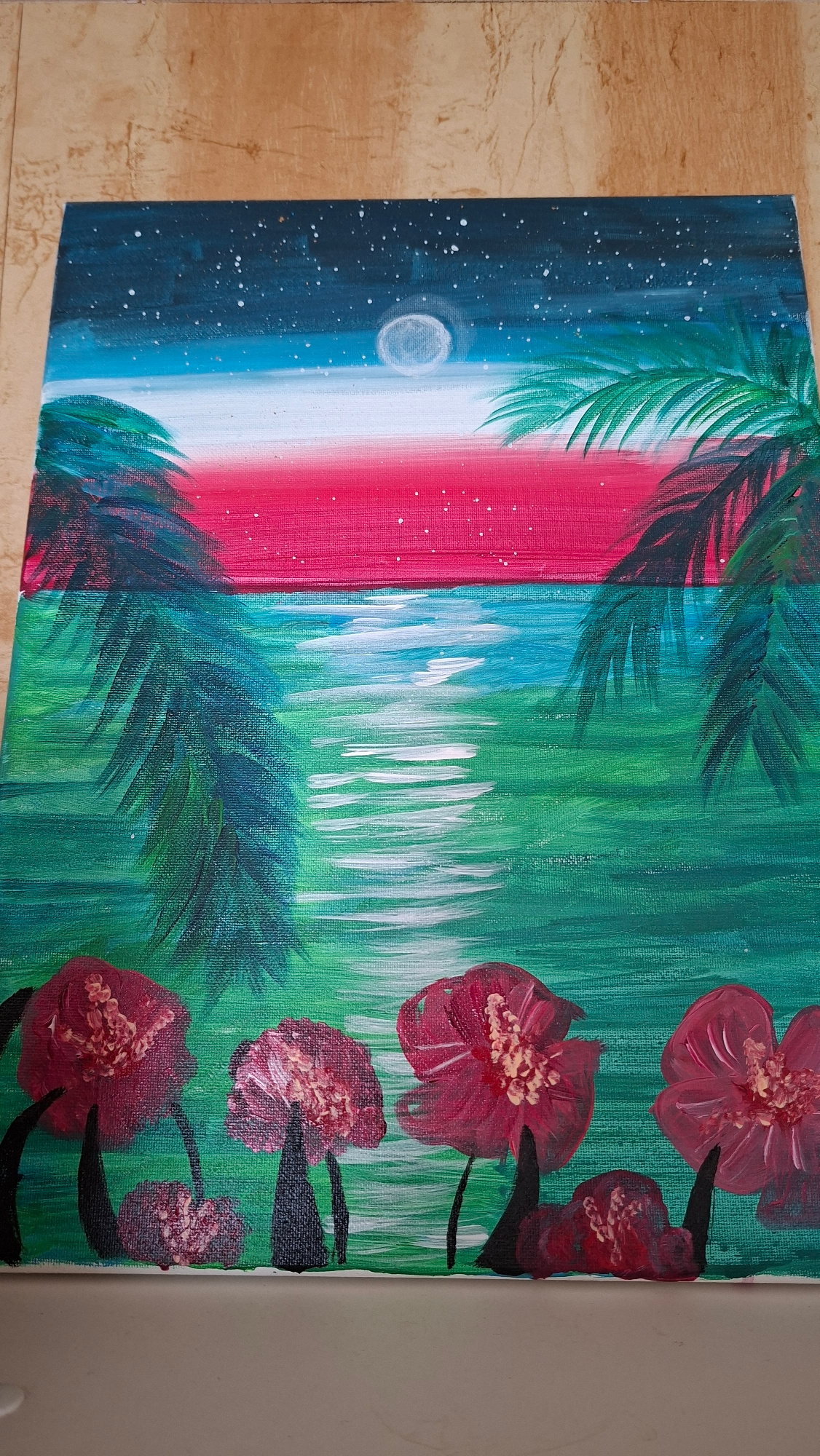 The media file displays an acrylic or oil painting on canvas, photographed with a textured light brown surface to its left. The painting itself is oriented vertically in the image, but depicts a horiz…read more