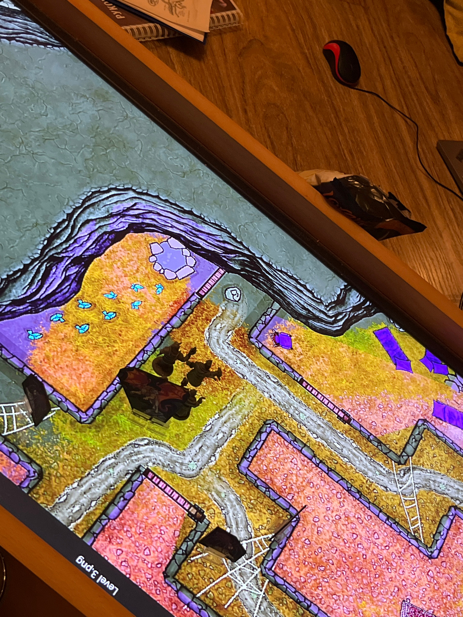 The image shows a tabletop digital display with a role-playing game map loaded. The map depicts a stylized fantasy landscape with various terrain features, including cliffs, a river or stream, and are…read more