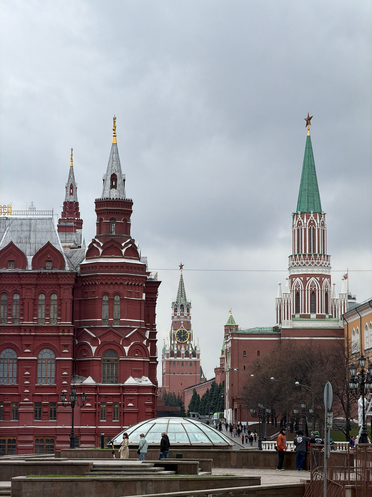 This image captures a vibrant urban scene in Moscow, Russia, showcasing iconic historical architecture under an overcast sky. In the left and central foreground, the State Historical Museum dominates…read more