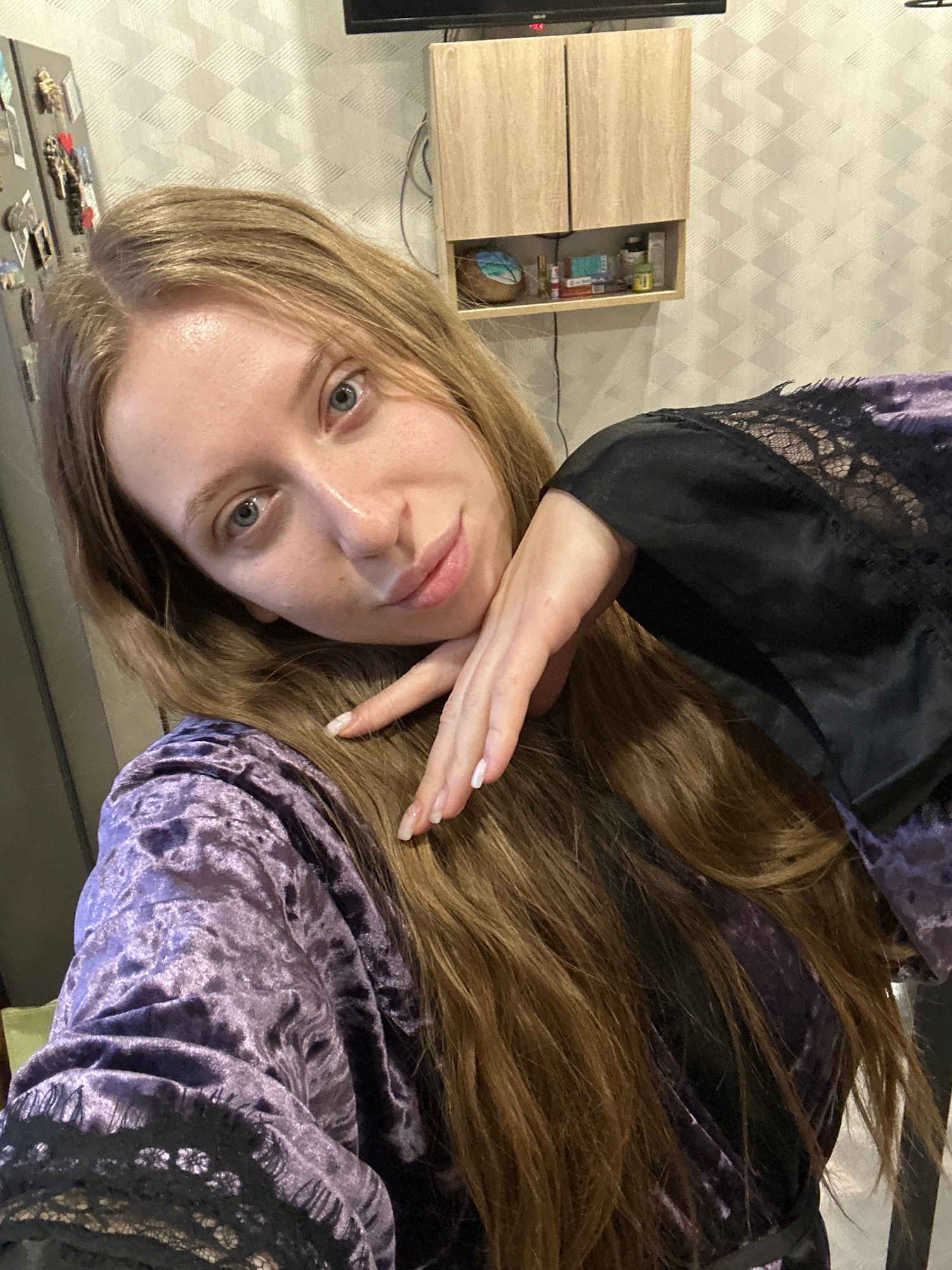 This media file is a portrait of a young woman, captured indoors, and is rotated 90 degrees clockwise. The woman, with fair skin, light brown hair, and blue eyes, looks directly at the camera with a n…read more