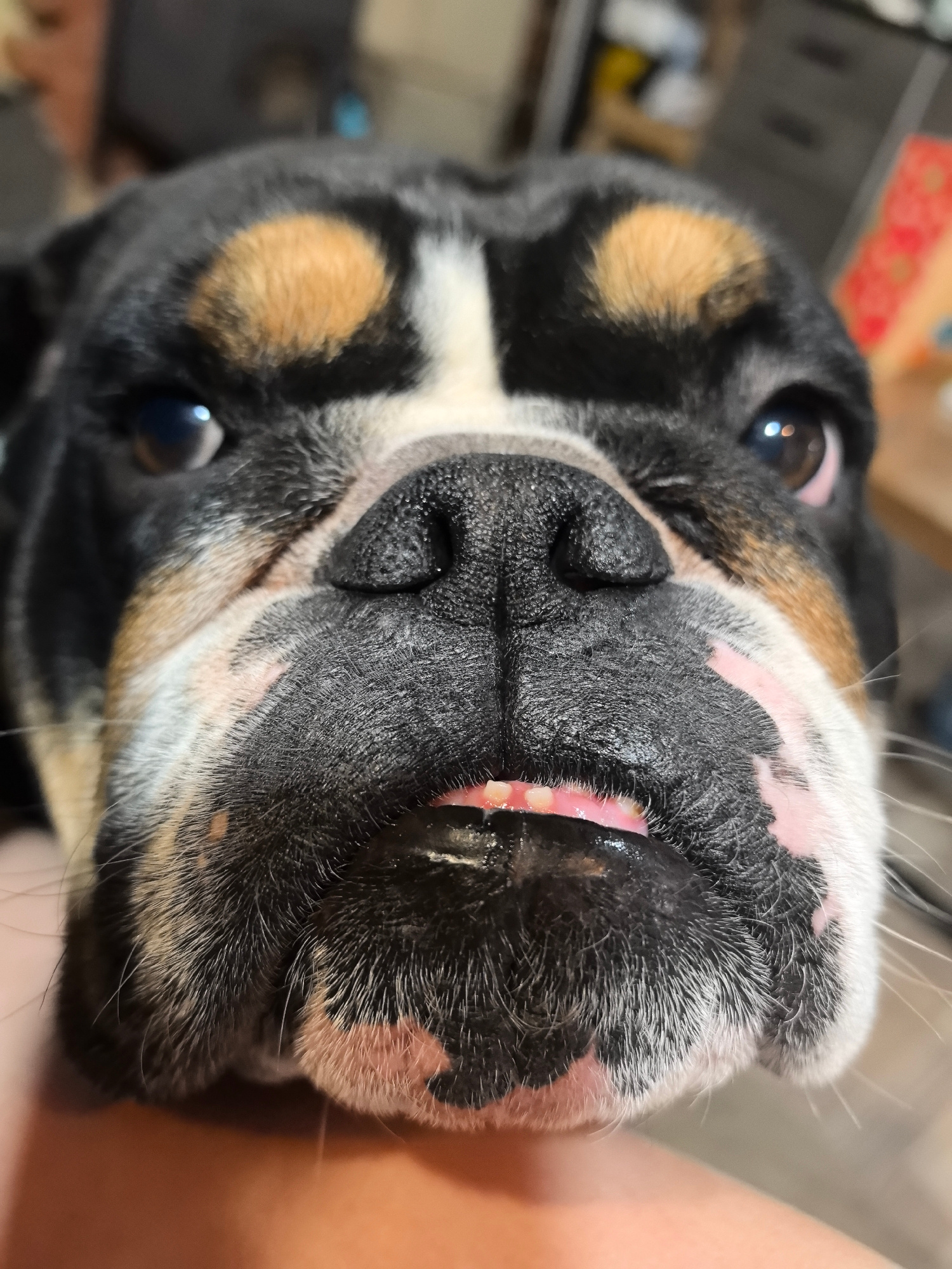 A close-up, head-on shot of a tri-color English Bulldog. The dog's face fills the frame, with the large, black nose, wrinkled muzzle, and small protruding tongue prominently displayed. The fur around…read more