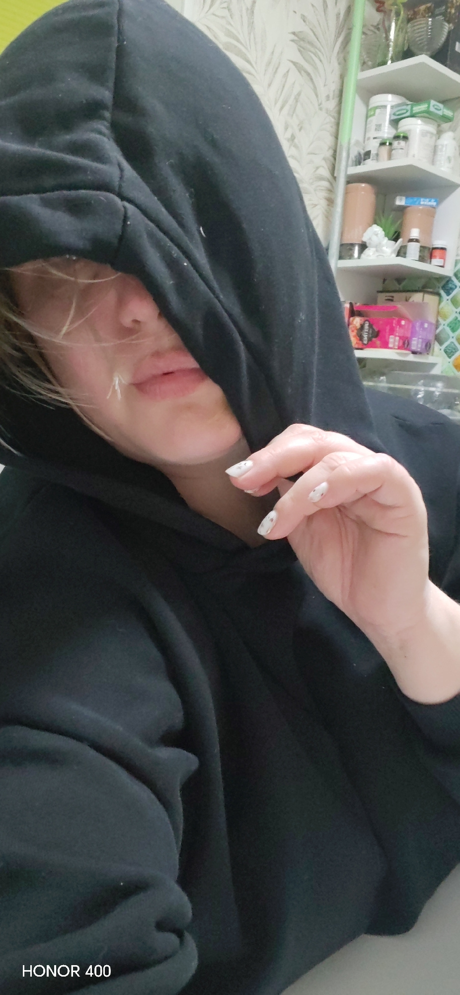 A person wearing a black hooded sweatshirt is shown indoors. The hood obscures part of their face. The person's hand is raised towards their face. A shelf with various items on it is visible in the ba…read more