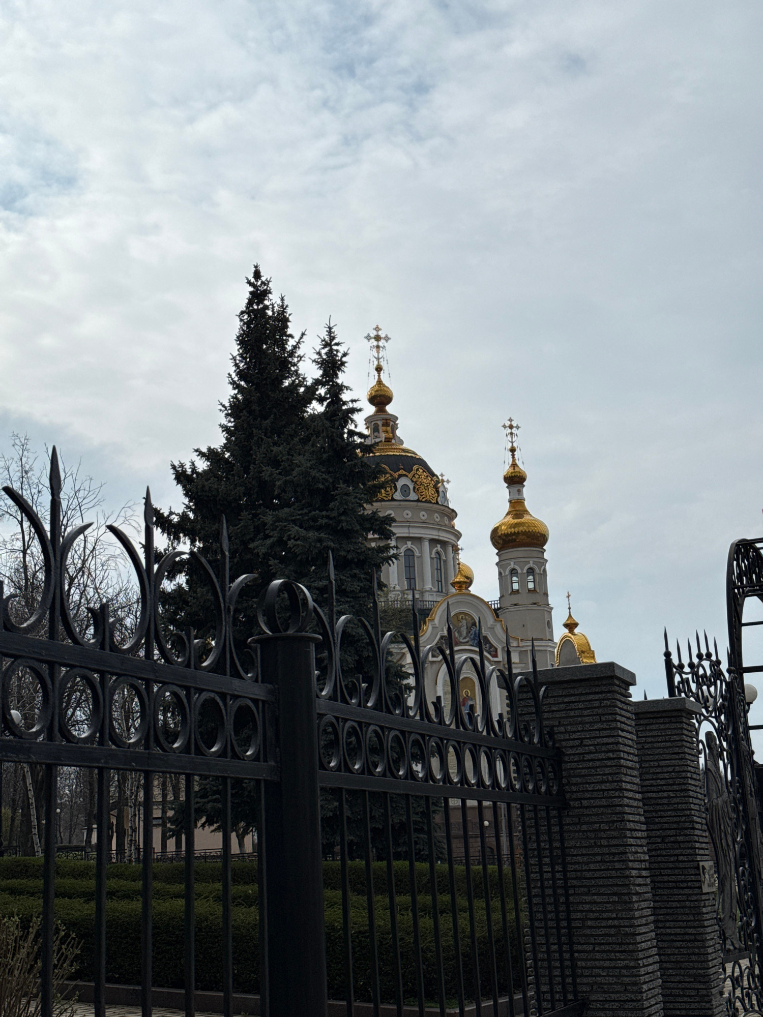 The image shows the St. Nicholas Cathedral in Donetsk, Ukraine, viewed through a wrought iron fence. The cathedral features gold domes and white walls, with crosses atop the domes. A tall evergreen tr…read more