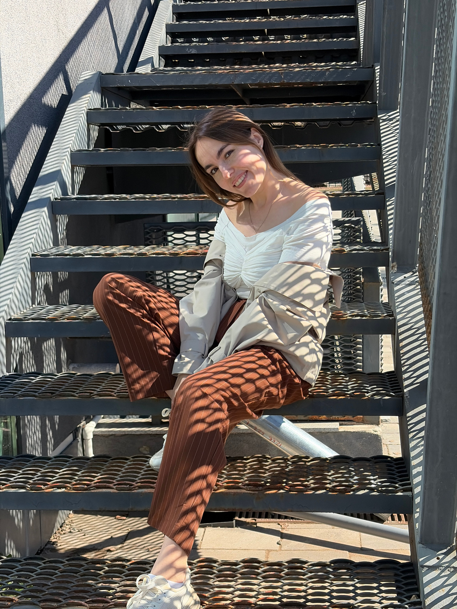 A young woman with long brown hair is posing upside down while sitting on a metal railing. She is wearing a white top, a beige jacket, and brown striped pants with white sneakers. The location appears…read more