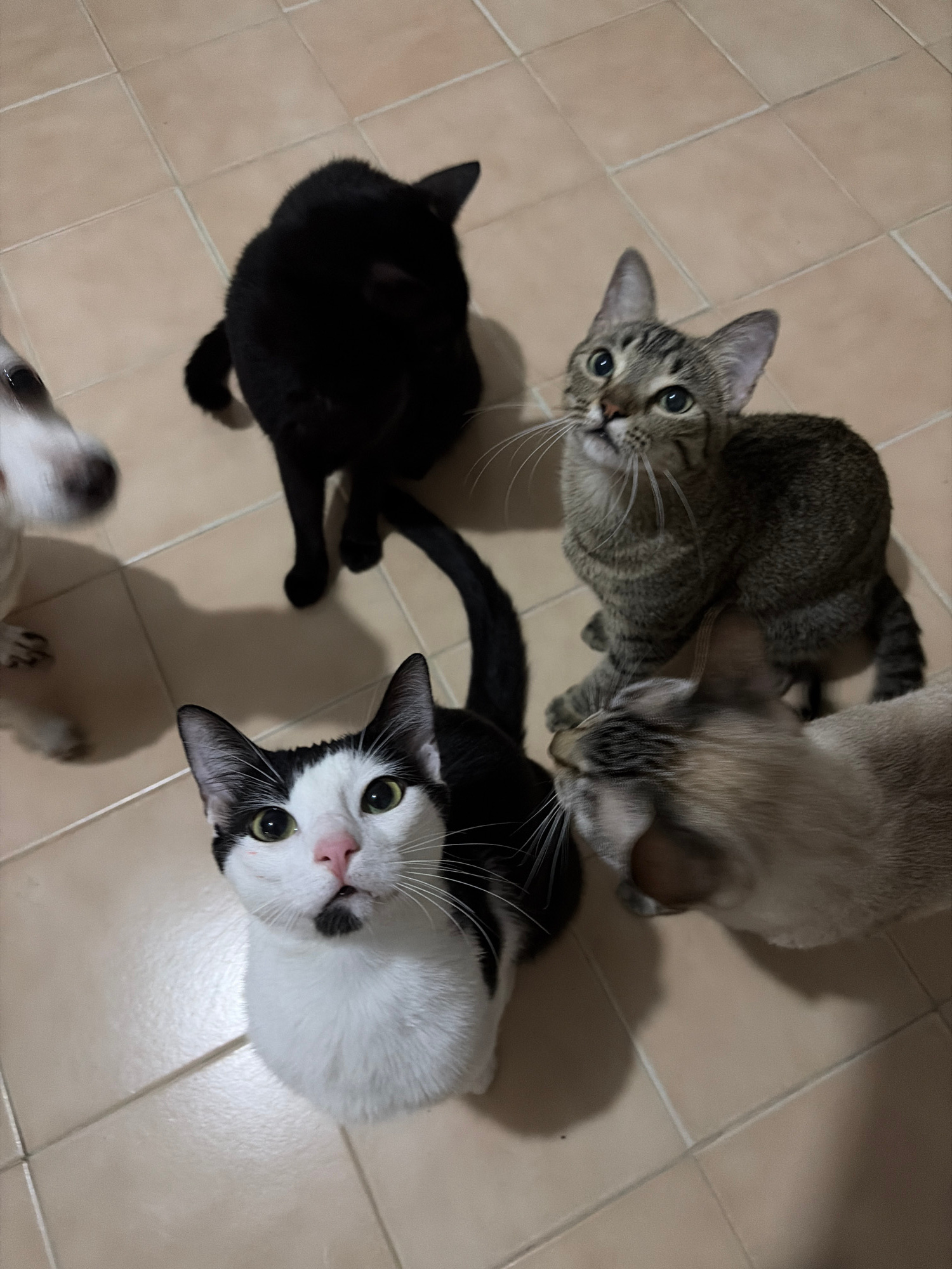 The image shows four cats on a beige tiled floor. From the top left, there is a tabby cat looking up at the camera. Beside the tabby cat, is a pale cat that looks to be sniffing the floor. To the left…read more
