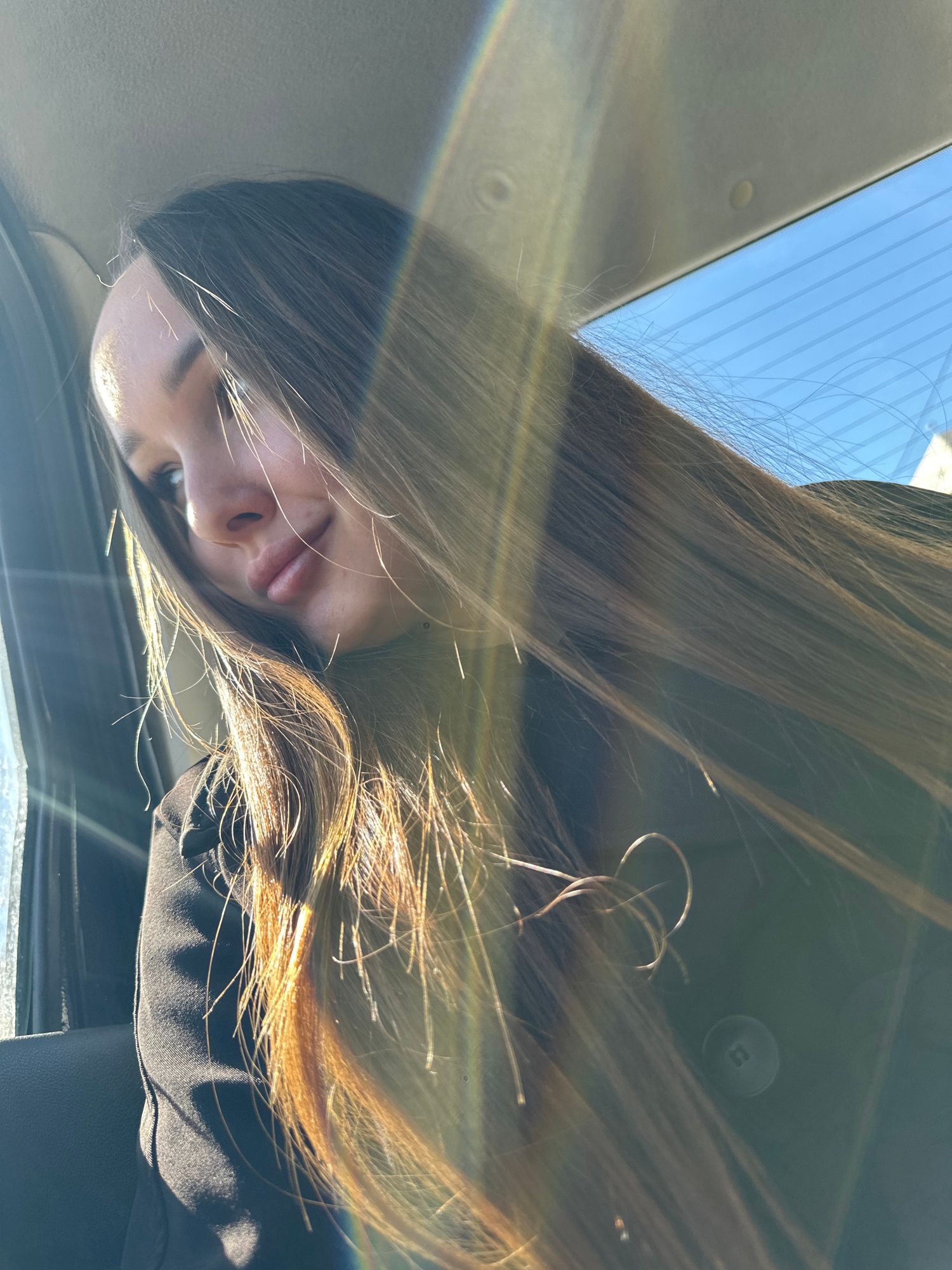 The image shows a woman with long brown hair, possibly inside a car. The scene is brightly lit with sunlight, creating a lens flare effect. The interior of the car is visible, including the roof and a…read more