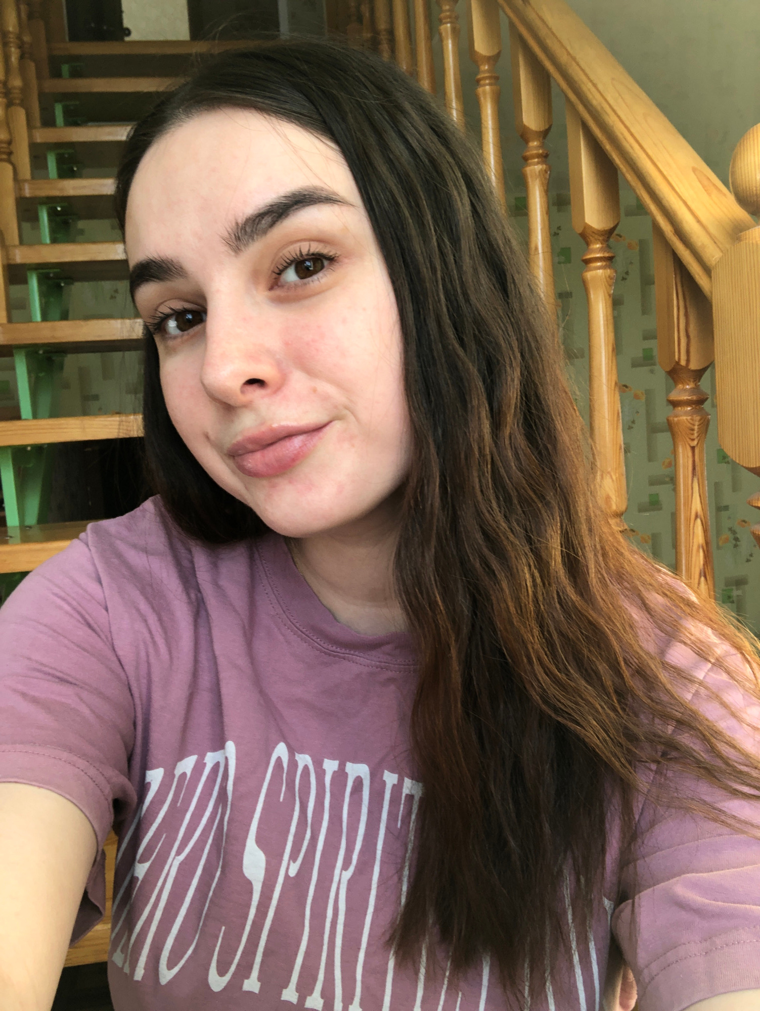 A person with brown hair and fair skin is shown in a selfie. They are wearing a mauve t-shirt with white lettering. The background includes a wooden staircase railing and patterned wallpaper. The loca…read more