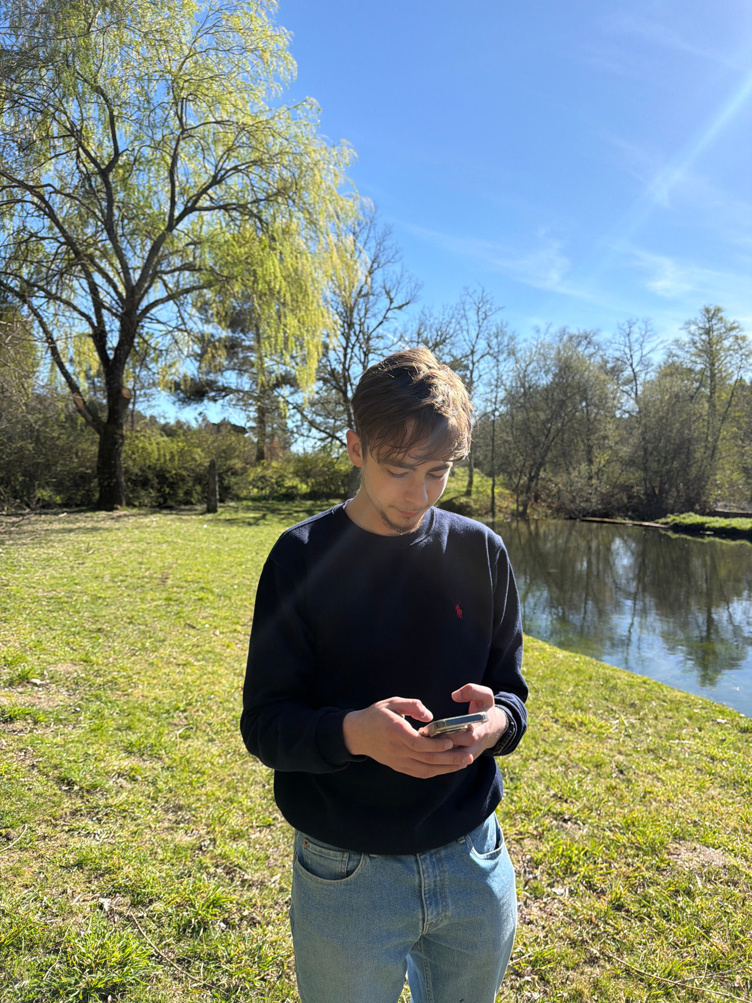 In an outdoor daytime scene in Vila Real, Portugal, a male individual stands on a grassy area beside a body of water. Positioned slightly left of center, he wears a navy blue long-sleeved sweatshirt w…read more