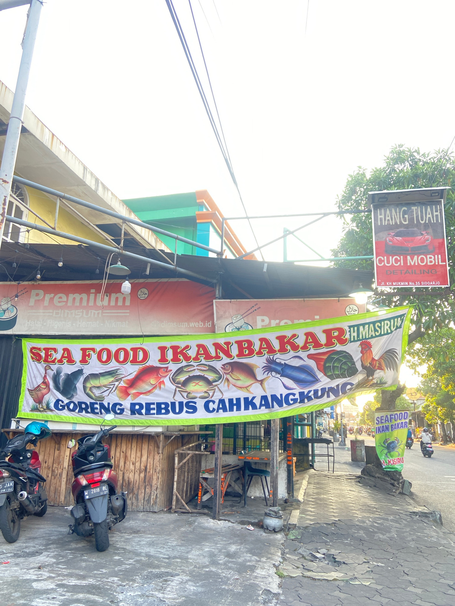 The image captures a street scene in Sidoarjo, Indonesia, showcasing a blend of businesses and everyday life. Dominating the view is a food stall, indicated by prominent signs advertising "SEA FOOD IK…read more