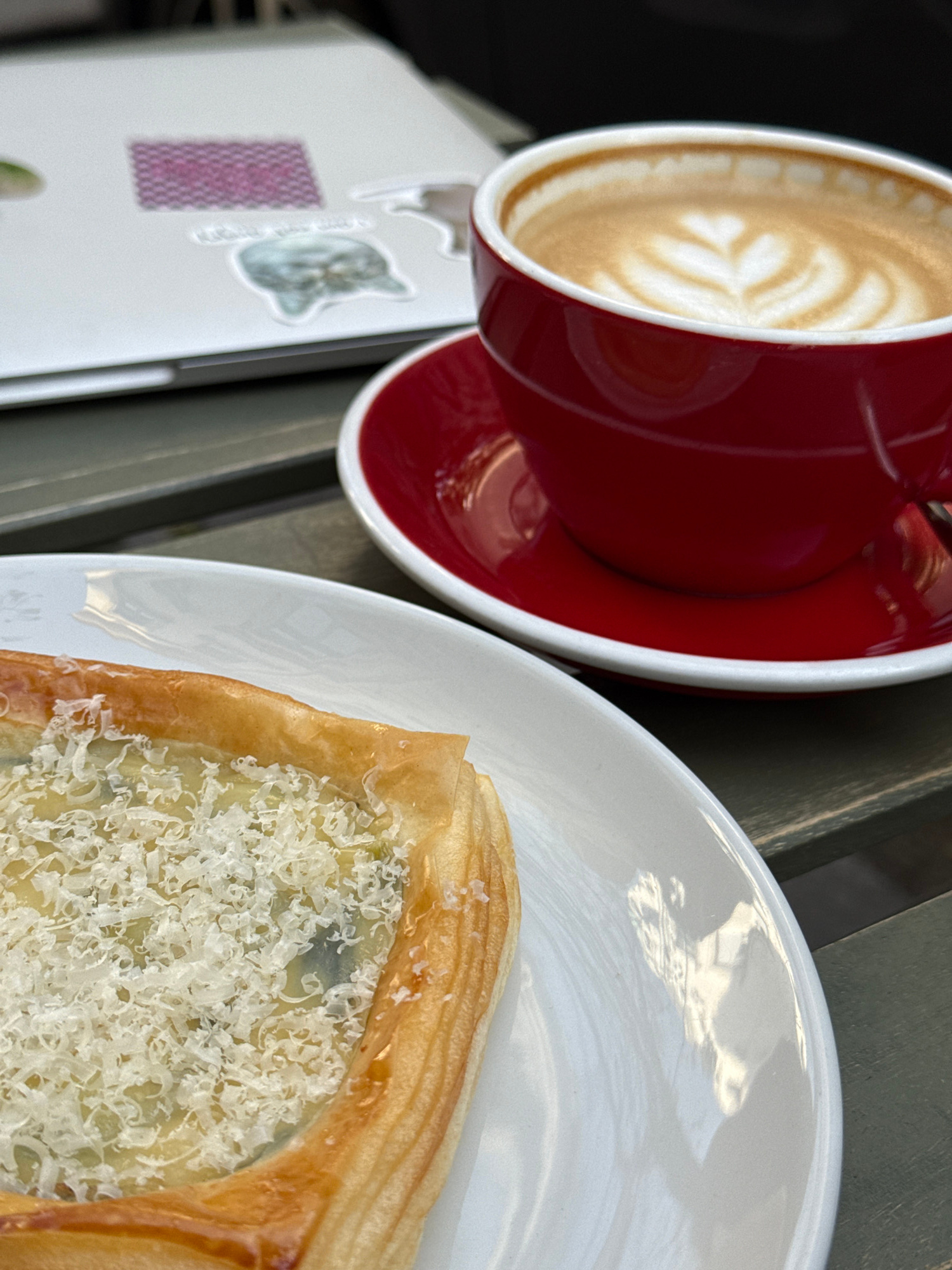 The image captures a top-down view of a table setting. A red cup filled with a latte, showcasing a leaf-like foam art pattern, sits on a matching red saucer. To the right, a white plate holds a pastry…read more