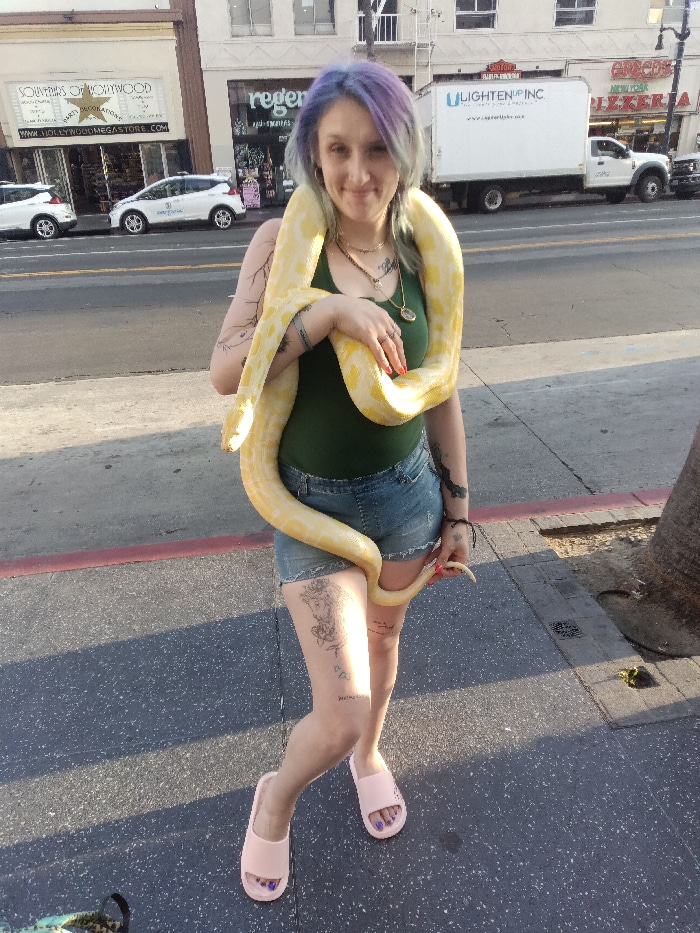 A female subject stands on a paved sidewalk on Hollywood Boulevard in Los Angeles, California, United States. She has multi-colored hair (blue, purple, grey), visible tattoos on her arms and both thig…read more