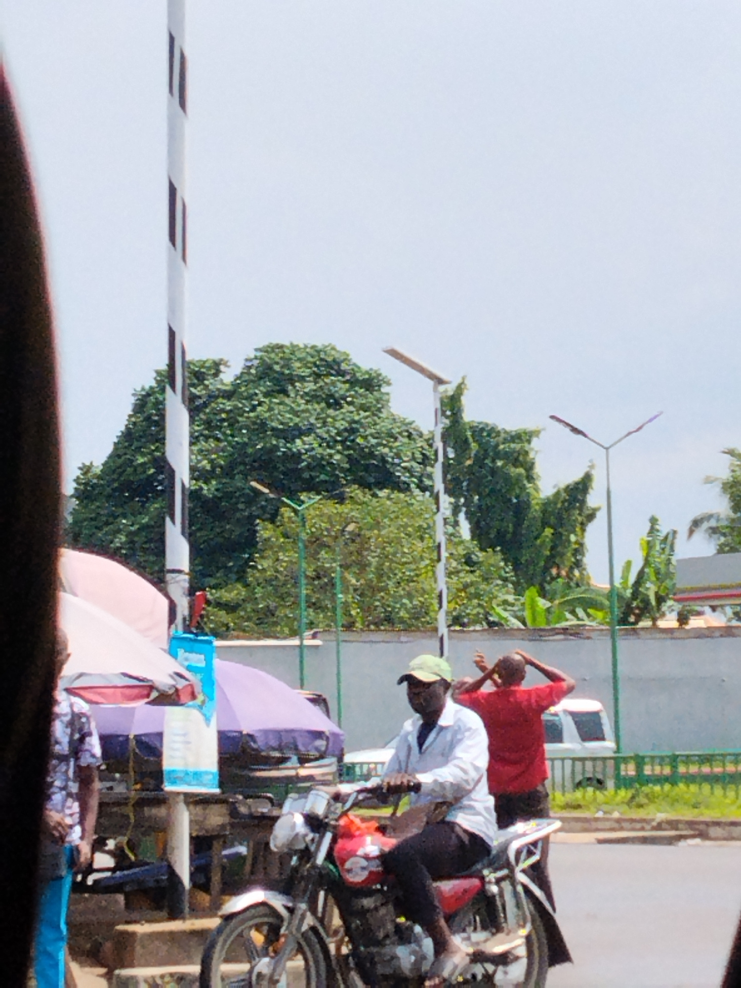 The image captures a street scene in Aba, Nigeria. A man wearing a white shirt and a light green cap is riding a red and silver motorcycle. A man in a red shirt stands nearby with his hands on his hea…read more
