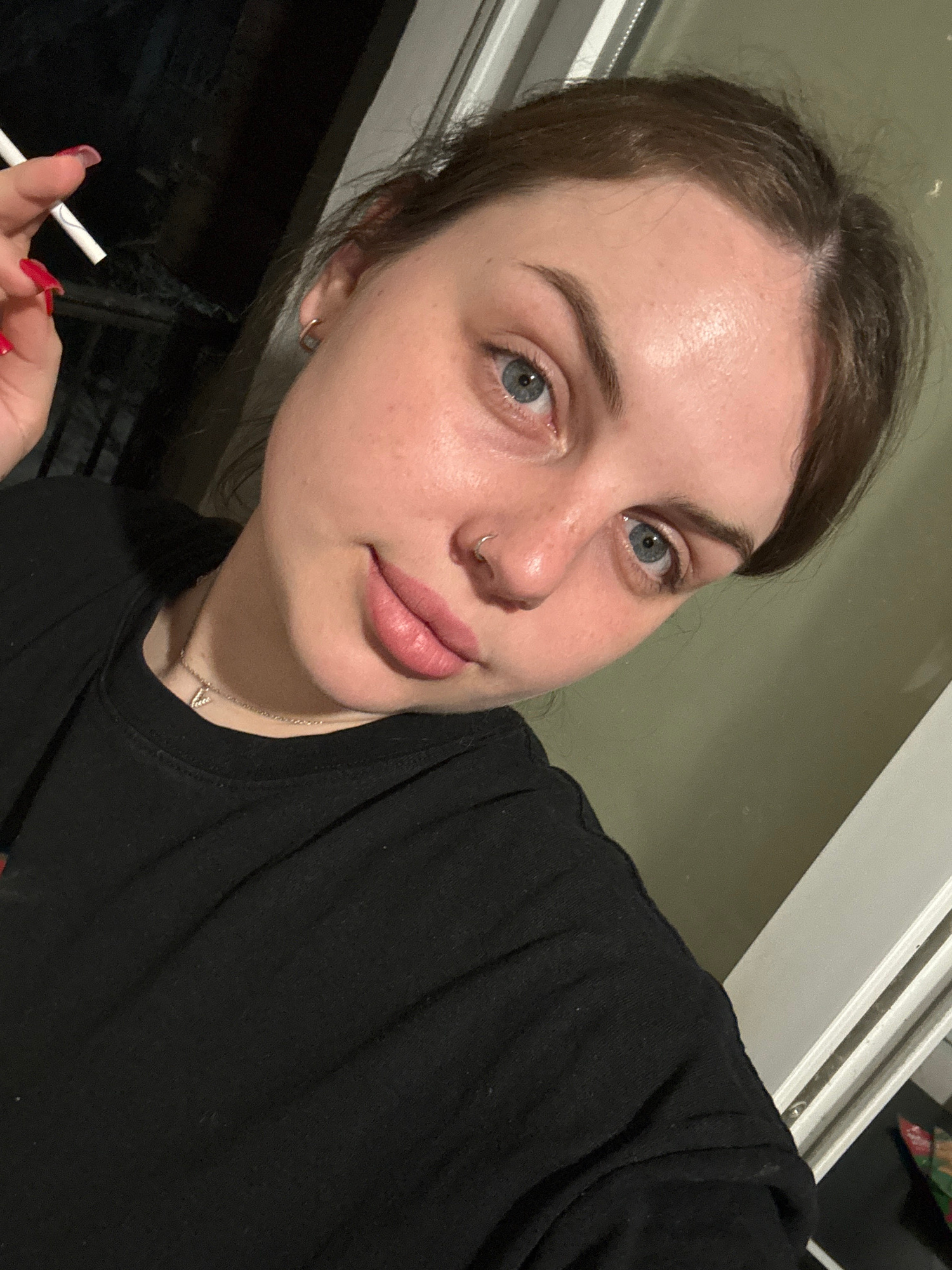 A close-up, high-angle shot shows a fair-skinned woman with brown hair and blue eyes, wearing a black shirt and a silver necklace. She has a nose ring in her left nostril, small hoop earrings, and red…read more