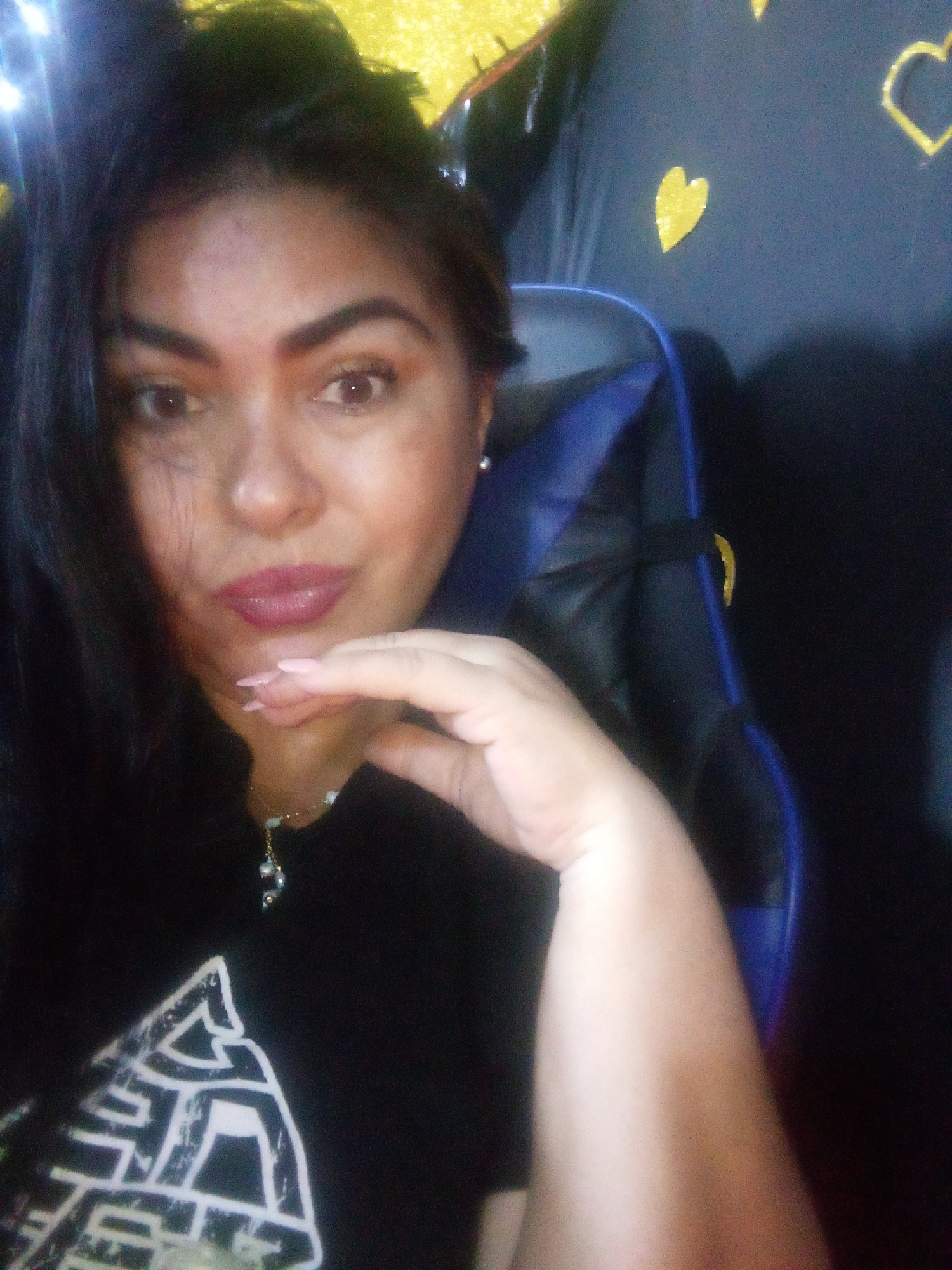 A woman with dark hair and light skin is in a selfie, wearing a black shirt and a necklace with a pendant. She is resting her hand on her chin. She is seated in a black and blue gaming chair. The back…read more