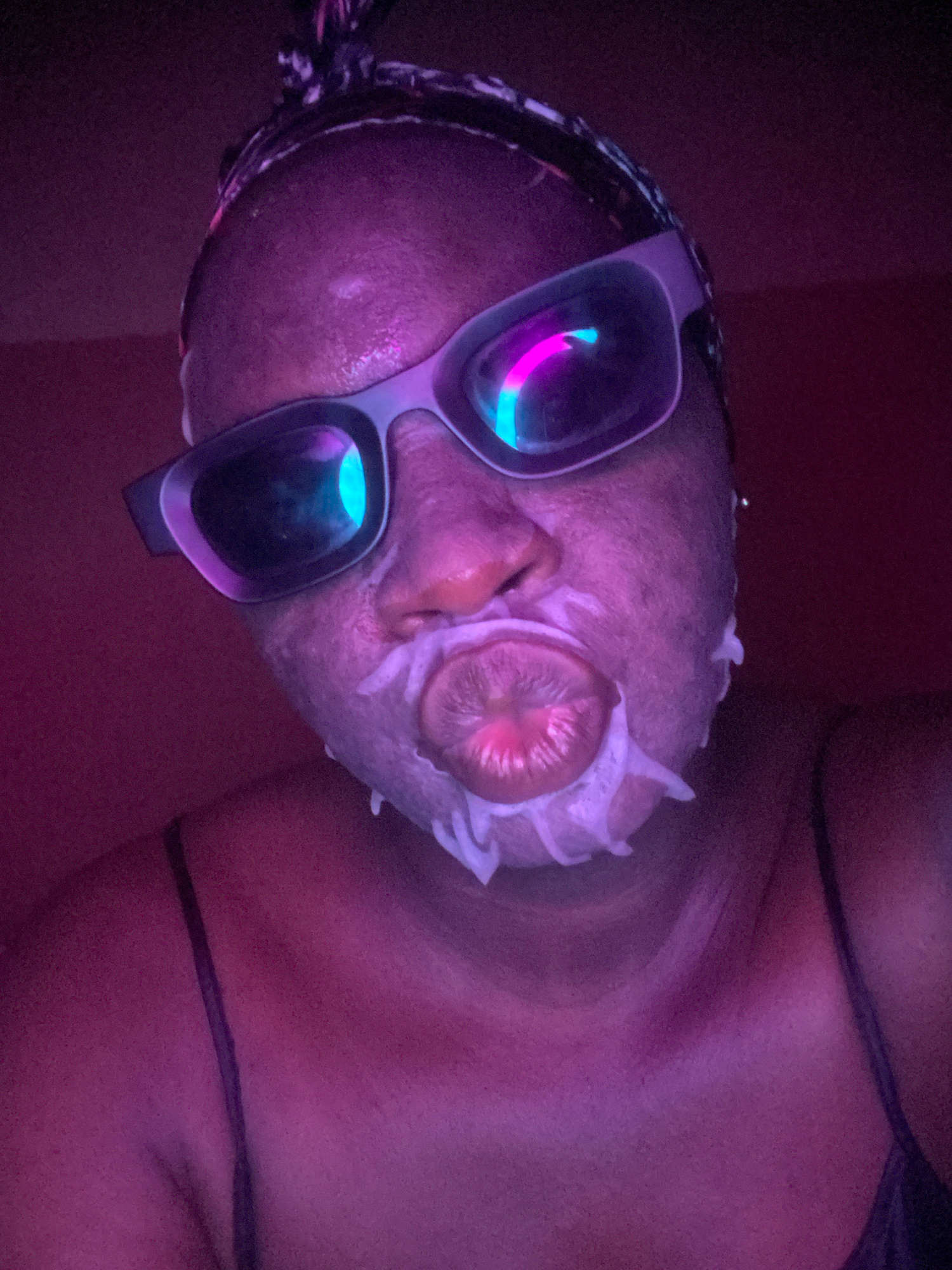 The image captures a person's face and upper chest, illuminated by strong purple and pink ambient lighting. The individual is wearing large, light-colored goggles, the lenses of which brightly reflect…read more