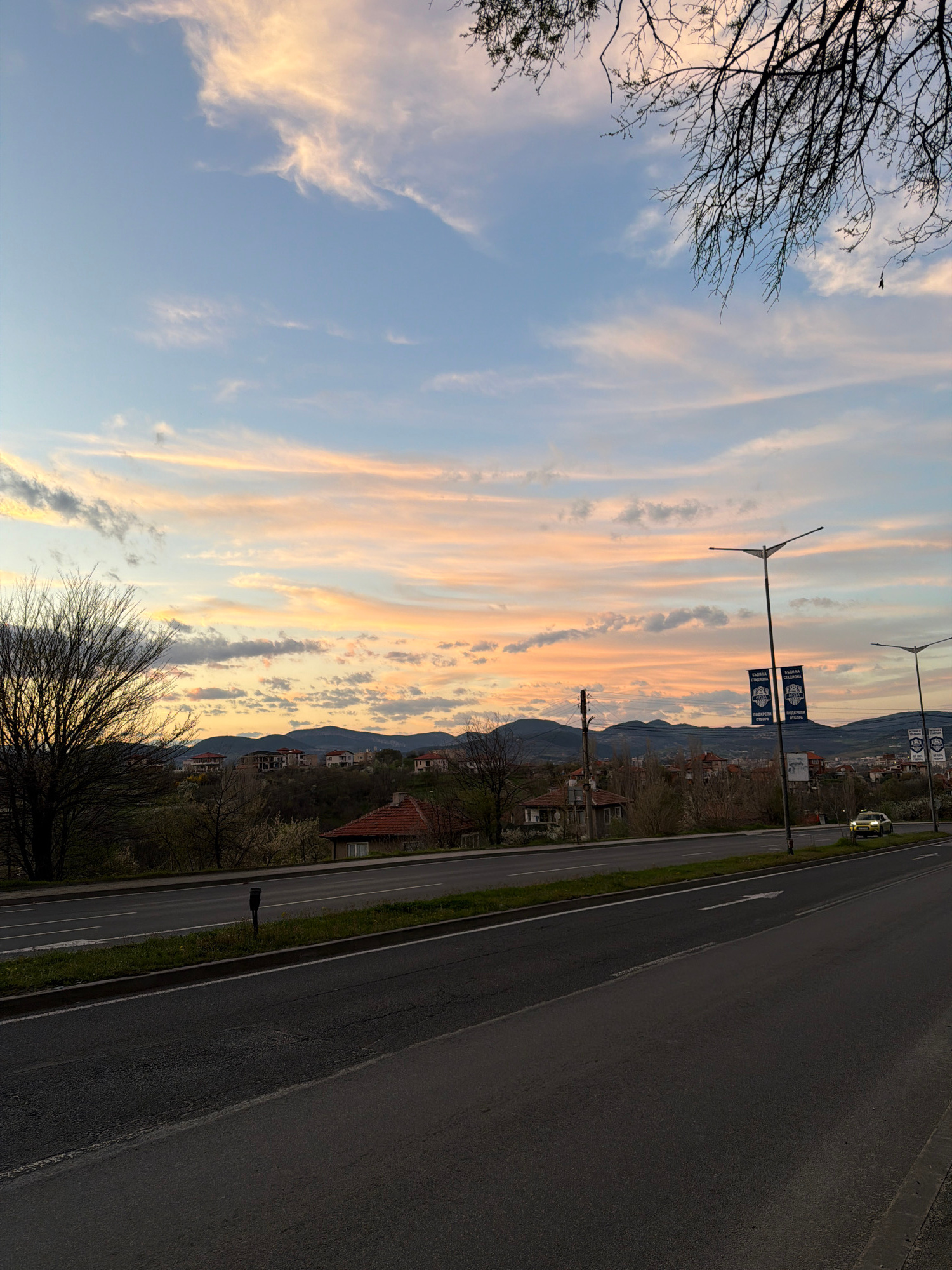 The image captures a twilight scene near the city of Kardzhali, Bulgaria. The sky is filled with streaky clouds tinged with orange and pink hues from the setting or rising sun. Bare tree branches fram…read more