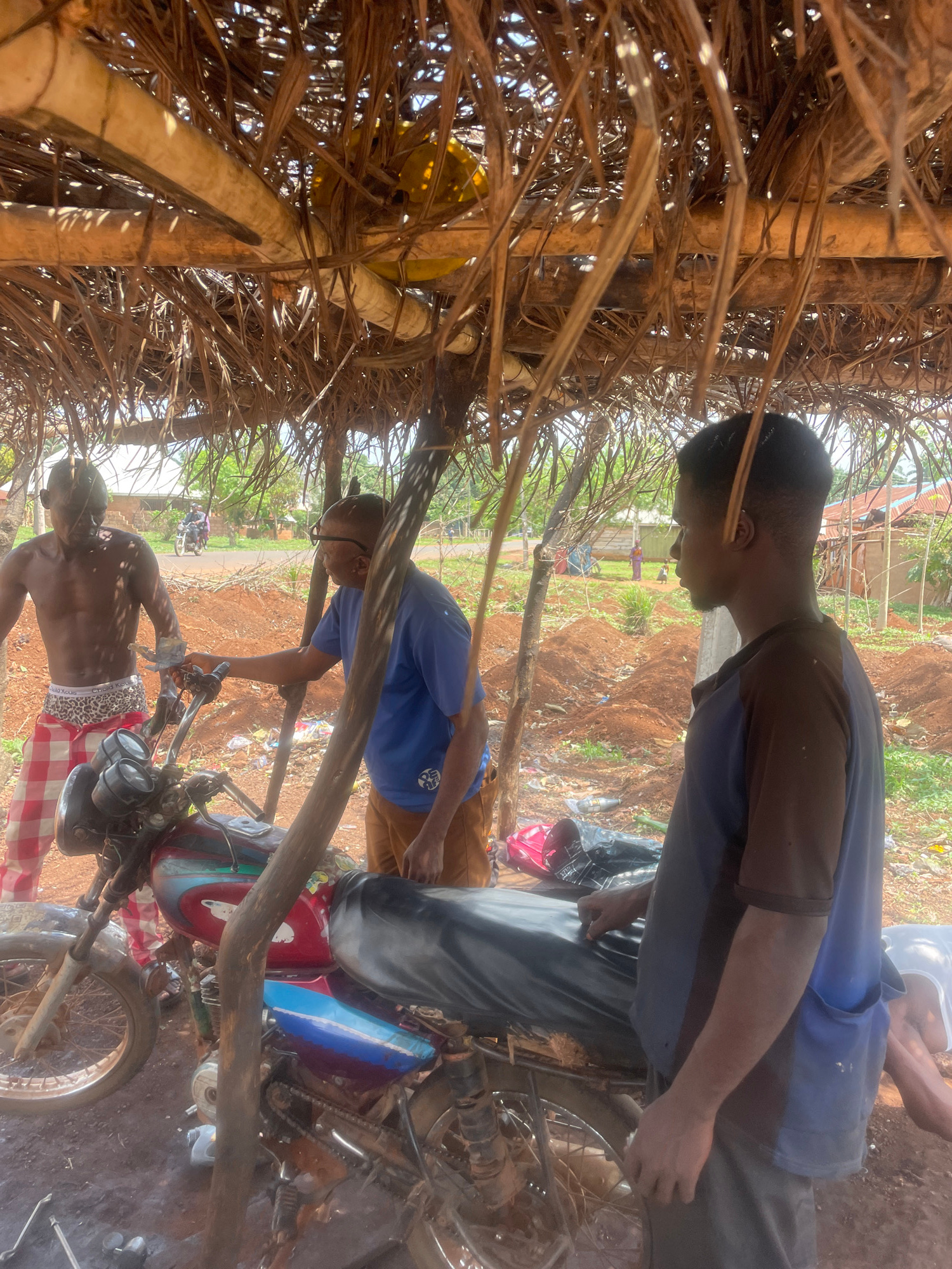 This rotated image captures an outdoor scene in Ogbe, Nigeria, under what appears to be bright daylight, possibly with some cloud cover or a high sun, casting soft shadows. The setting is a rustic she…read more