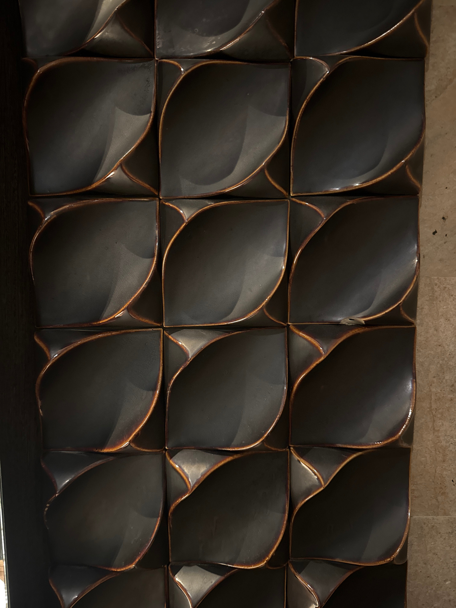 A close-up shot presents a wall composed of dark, possibly black or very dark gray, tiles with a distinctive three-dimensional, curved design. The tiles are square and arranged in a grid pattern. The…read more