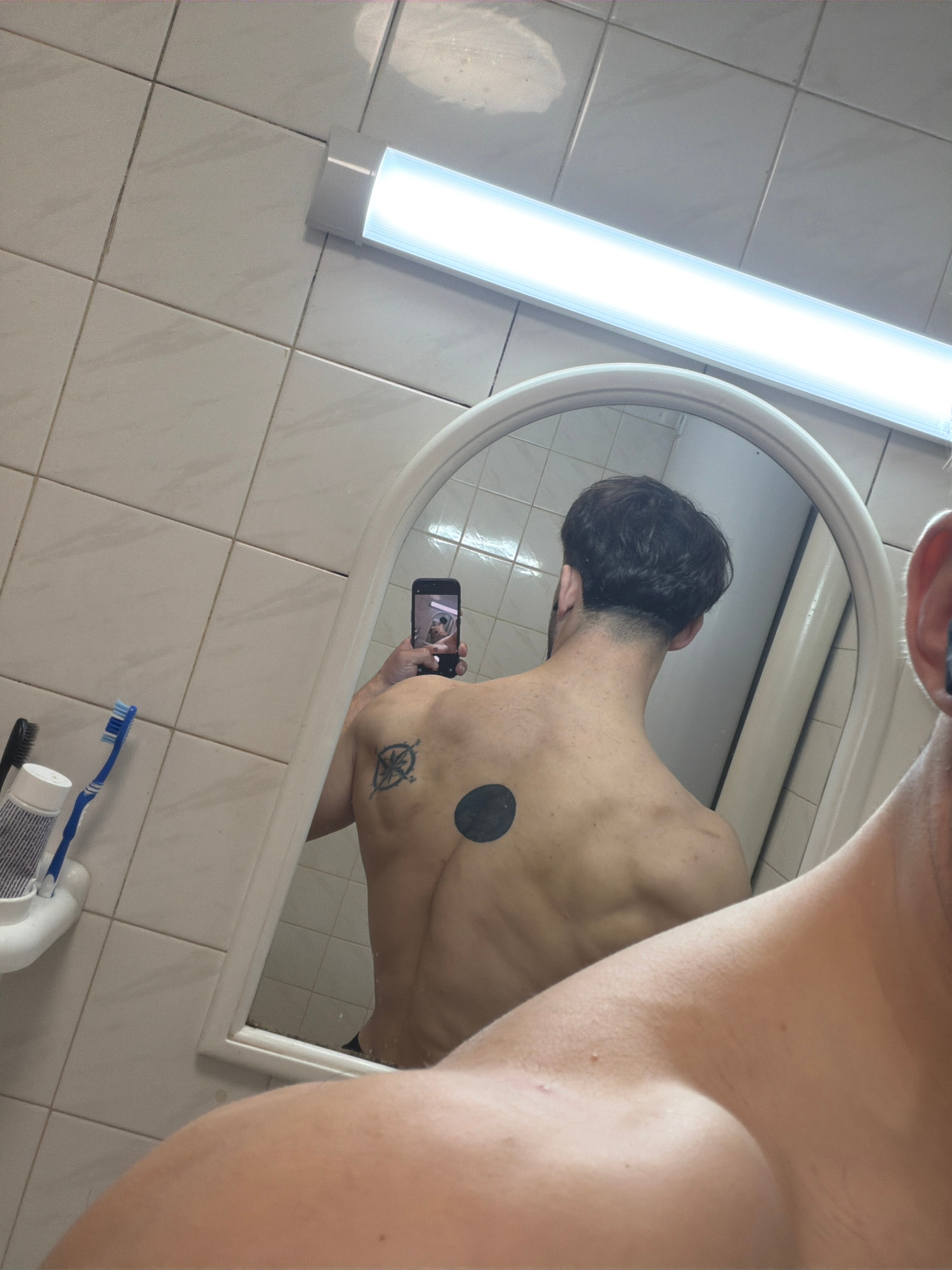 The image shows a person in a bathroom, taking a picture of themselves in a mirror. The person is shirtless, revealing two tattoos on their back. The bathroom has white tiled walls and a fluorescent l…read more