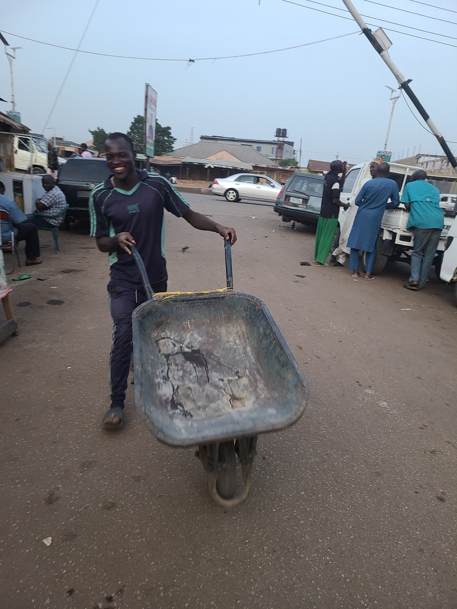 The image depicts a man in Jos, Nigeria, pushing a wheelbarrow on an asphalt street. The man wears a dark tracksuit with light green stripes and appears to be smiling. The wheelbarrow is old and contaβ¦read more