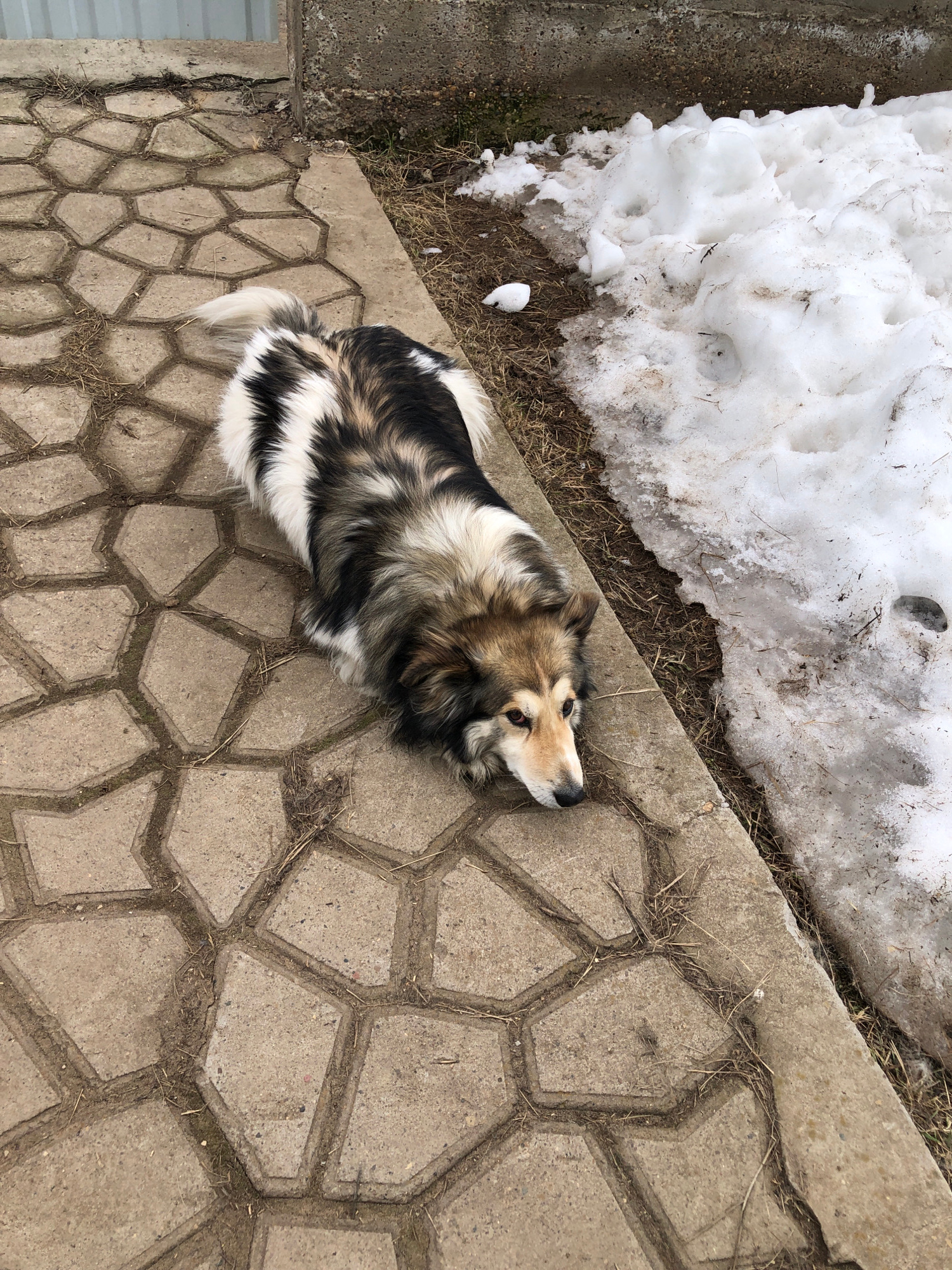 A medium-sized, long-haired dog lies on a concrete path made of interlocking polygonal blocks. The dog has a mix of black, white, and brown fur. To the left of the path is a patch of melting snow, and…read more