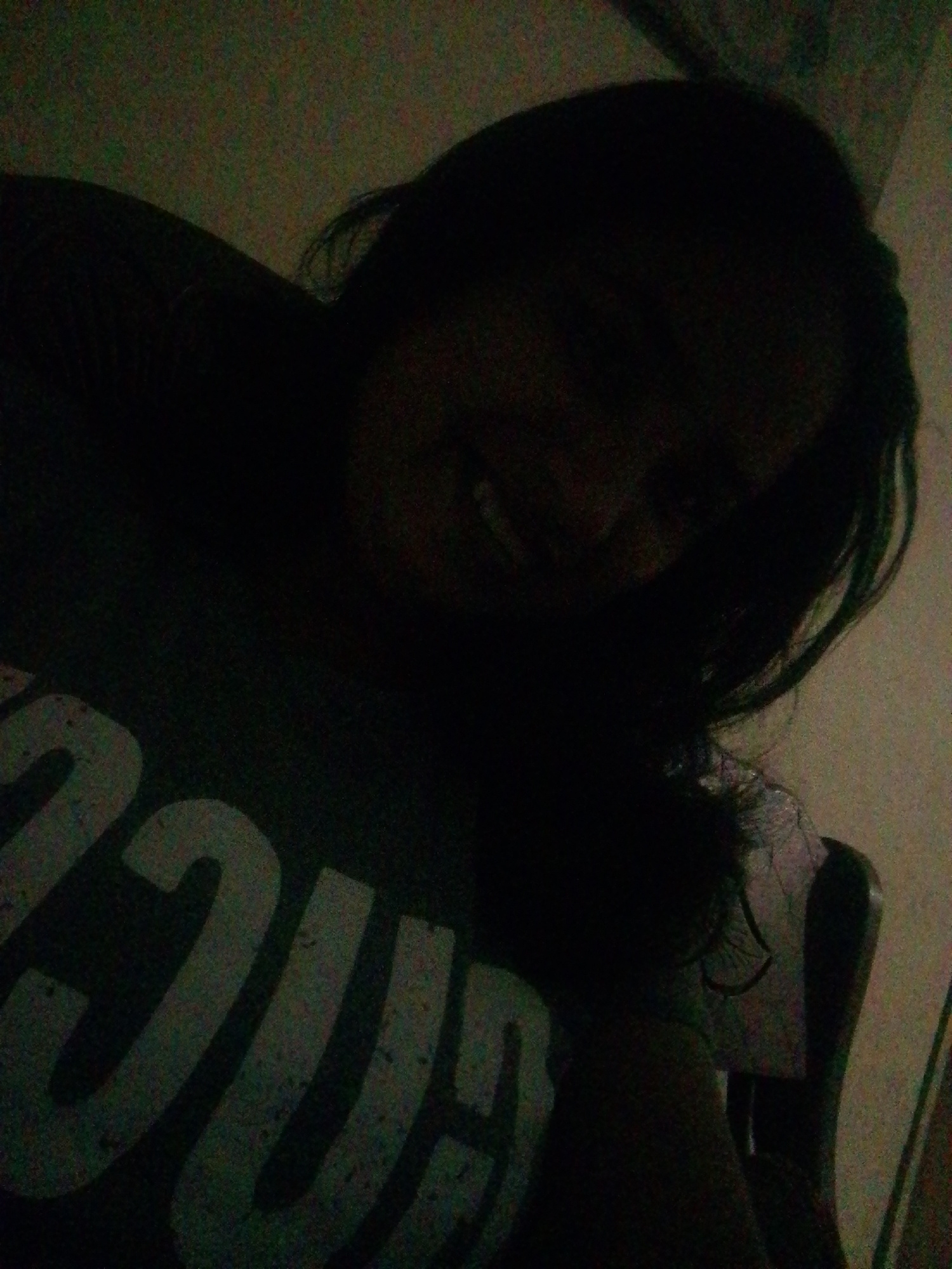 A dimly lit photo of a person with dark hair, smiling slightly. They are wearing a dark t-shirt with large, light-colored lettering. The background is indistinct but appears to be an interior space. T…read more