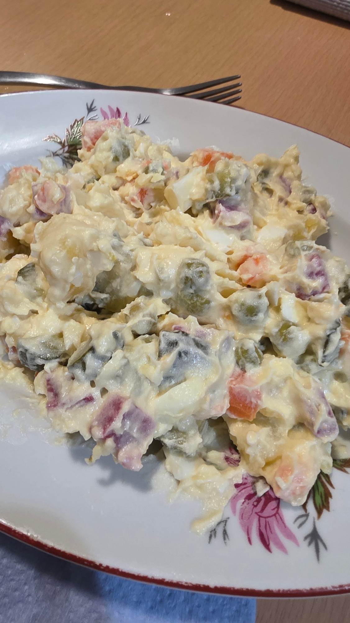 The image presents a close-up, overhead view of a plate of potato salad, positioned on a light-brown wooden table. The main subject is a creamy, mayonnaise-based potato salad generously served on a wh…read more