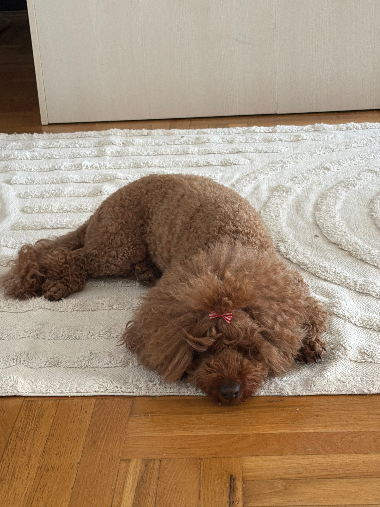 A reddish-brown poodle with a red and white striped bow sleeps on a white textured rug, which sits adjacent to a light-colored cabinet on the left and a wooden floor on the right. The scene is indoors…read more