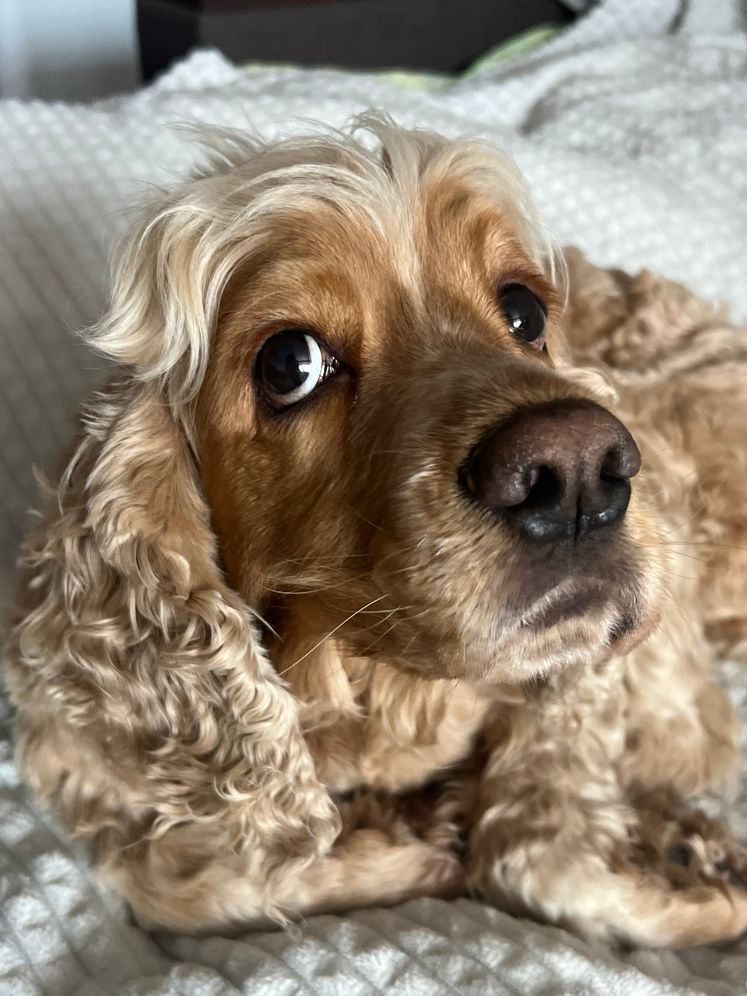 A close-up shot of a light brown dog, possibly a Cocker Spaniel, lying on its back on a light-colored, textured surface that appears to be a blanket or bedspread. The dog is looking upwards with its d…read more