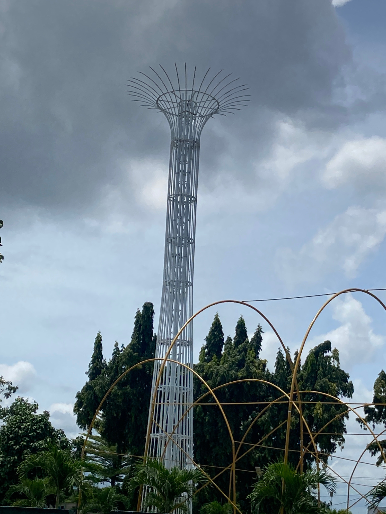 The image shows a tall, white metal sculpture in Calabar, Nigeria. The sculpture resembles a stylized tree or tower, with a flared top and a cylindrical body constructed from horizontal and vertical m…read more