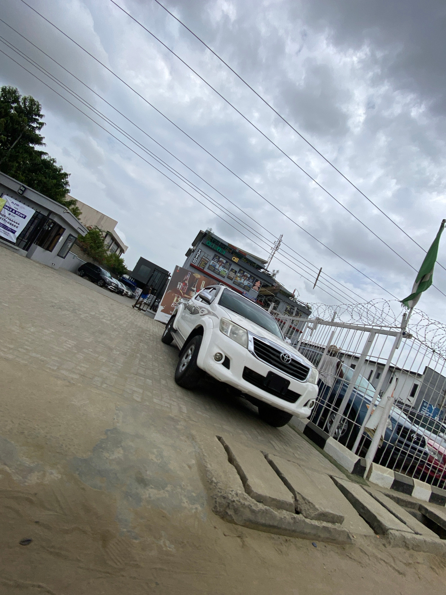 The scene shows a white Toyota Hilux parked on a paved surface in what appears to be an urban setting in Lekki, Nigeria. Overhead are cloudy skies with electrical lines. A green and white flag flies n…read more